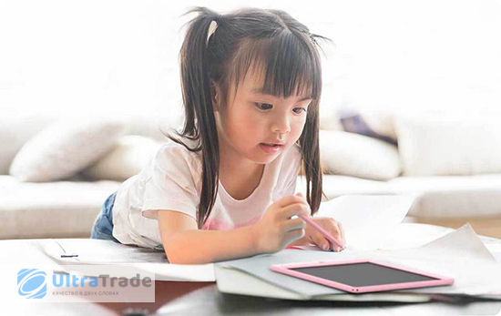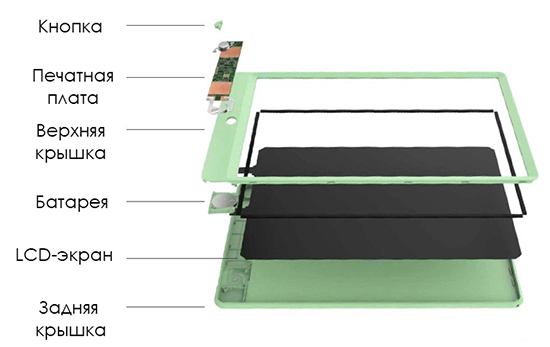 Планшет выполнен из прочного пластика, устойчивого к механическому воздействию и деформации. В комплектации данной модели предусмотрен стилус, при использовании которого на экране появляются яркие зеленые линии. Чтобы удалить изображение, необходимо нажать на кнопку стирания, расположенную на корпусе устройства. Также, если вы хотите сохранить рисунок, но боитесь случайного стирания, воспользуйтесь специальным блокиратором.