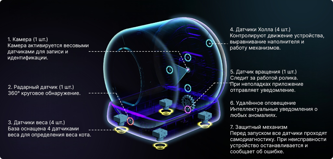 | Здоровье под контролем: тревожные сигналы не упущены Зачем это нужно? Чтобы быть на шаг впереди болезни. Лоток скрупулезно ведет дневник здоровья для каждого питомца:- Динамика веса: Малейшие изменения, которые могут говорить о стрессе, диабете или проблемах с щитовидкой, не останутся незамеченными.- Статистика посещений: Участившиеся или, наоборот, слишком редкие визиты — первый симптом проблем с мочеполовой системой.- Средняя продолжительность: Если кошка проводит в лотке слишком много времени, это может сигнализировать о запоре или трудностях с мочеиспусканием.Приложение превращает эти данные в наглядные графики, позволяя вам вовремя заметить тревожные тенденции и показать питомца ветеринару.Все под контролем: умное приложение и простая панель управленияУправление лотком организовано с двойным доступом — для любителей технологий и для тех, кто ценит простоту. Интуитивная панель управления на самом устройстве состоит всего из трех кнопок:- Очистка: запуск цикла уборки одним нажатием- Выравнивание: распределение наполнителя по дну лотка- Замена: полное опустошение барабана от старого наполнителяДля тех, кто хочет большего, разработано специальное мобильное приложение поддерживающее русский язык. Оно открывает доступ к расширенным настройкам:- Настройка Wi-Fi для удаленного управления- Режим «Не беспокоить» в ночное время- Защита от детей- Просмотр истории активности всех питомцевПриложение поддерживает многопользовательский доступ — все члены семьи могут следить за показателями кошек. |
