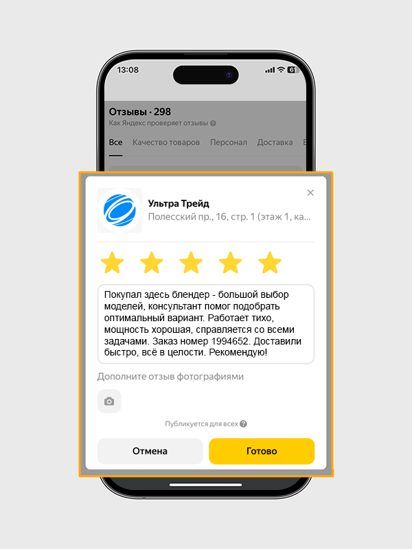 - Напишите текстовый отзыв о вашем опыте покупок в магазине Ультра Трейд. По желанию добавьте фото покупки. Сделайте отзыв максимально полезным для других покупателей. В тексте отзыва обязательно укажите номер вашего последнего заказа в магазине. Нажмите "Готово".
