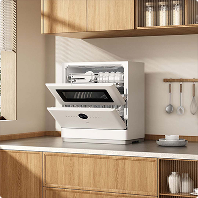 Это умная настольная посудомоечная машина, которая сочетает в себе стильный дизайн, передовые технологии и удобство использования. Благодаря вместимости на 6 комплектов посуды и множеству инновационных функций, эта модель станет идеальным решением для небольших семей или современных квартир благодаря гибкости установки — она подходит для U-образных, линейных и компактных кухонь.