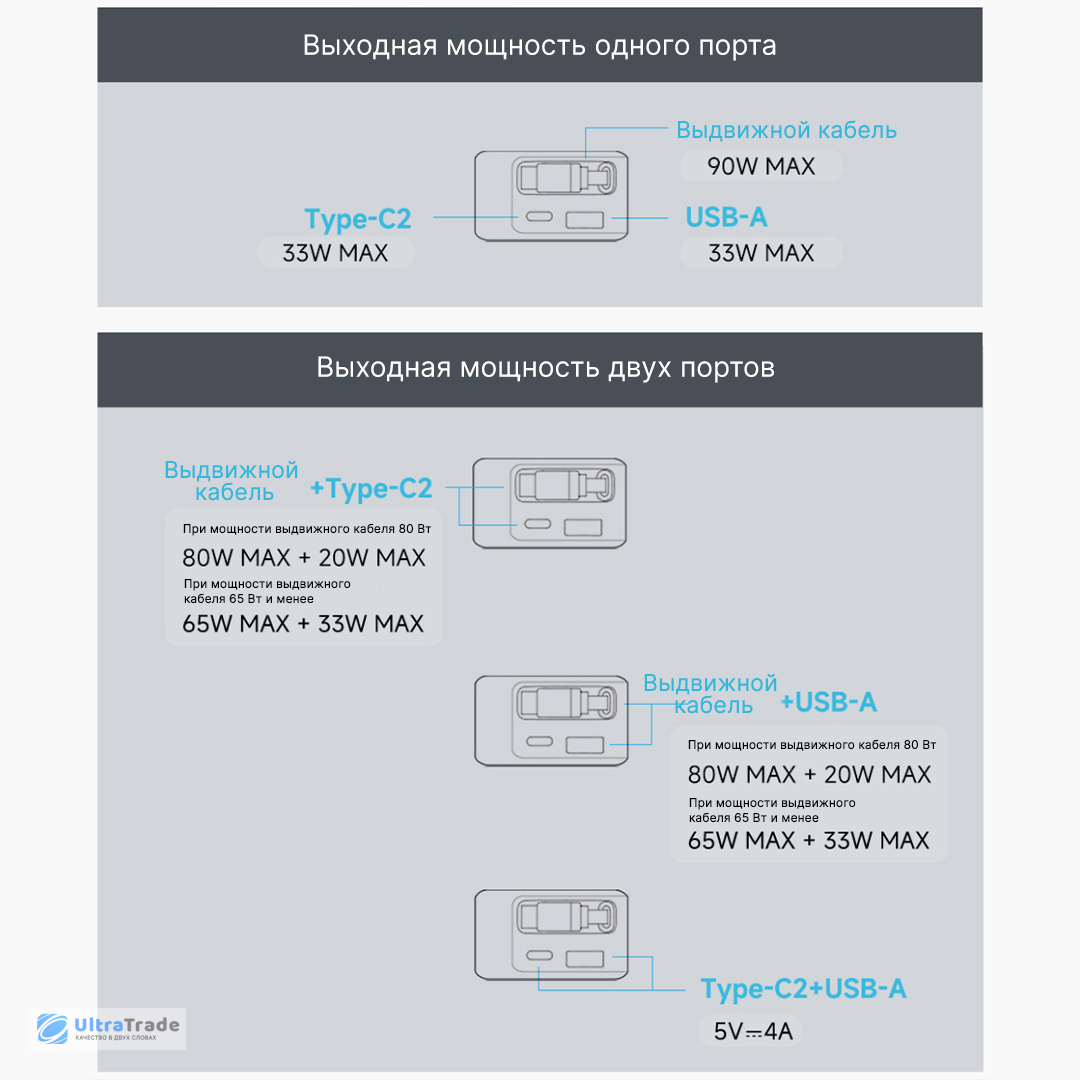 ![]() Распределение мощности Встроенный чип автоматически определяет тип устройства и оптимально распределяет мощность между двумя портами для быстрой зарядки. Доступны два режима: 80 Вт + 20 Вт или 65 Вт + 33 Вт, чтобы оба гаджета быстро восстанавливали заряд. |