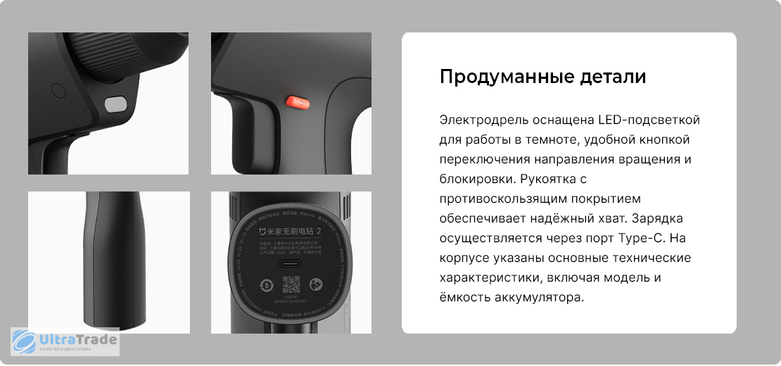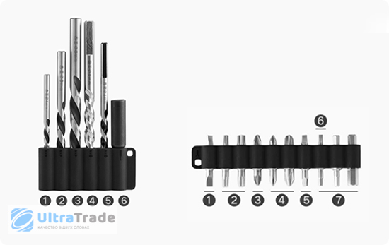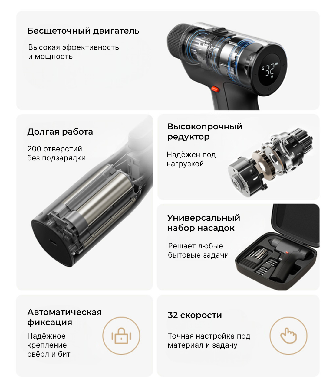 Универсальность для любого материала, наборы свёрл и бит Инструмент эффективно работает с разнообразными поверхностями — от сухих (стены, металл, пластик) до влажных (плитка, мрамор, бетон). Просто выберите подходящий режим для материала, и можно сразу приступать к работе. В комплект входит 3 типа свёрл: по дереву (4/6/8 мм), ударное (8 мм) и керамическое (6 мм), плюс удлинитель на 60 мм. Набор бит включает 7 типов — под любую головку: плоские (SL4, SL5), звёздные (T15, T20, T25, T30), крестовые (PZ1, PZ2), крестообразные (PH0, PH1, PH2, PH3), четырёхгранные (S1, S2), треугольные (2.3 мм), шестигранные (H2–H6). |