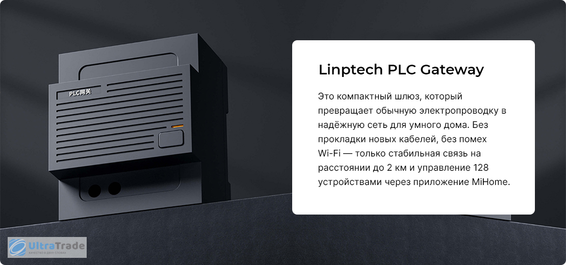 • Через один Ethernet-порт шлюз подключается к роутеру, а все совместимые устройства Linptech (розетки, выключатели, датчики) общаются с ним по электропроводке.
