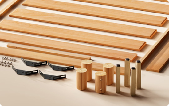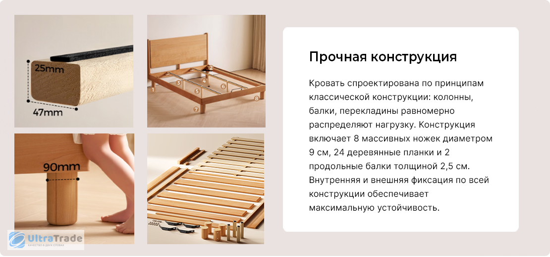 Шиповое соединение и металлические крепления Вместо клея детали соединяются с помощью шиповых соединений. Это древняя техника, при которой элементы плотно входят друг в друга, образуя монолитную конструкцию. Шиповые соединения дополняются высококачественной металлической фурнитурой, которая фиксирует детали в заданном положении. Это своего рода «металлический каркас», который исключает люфт и делает кровать устойчивой даже при активном использовании. |
