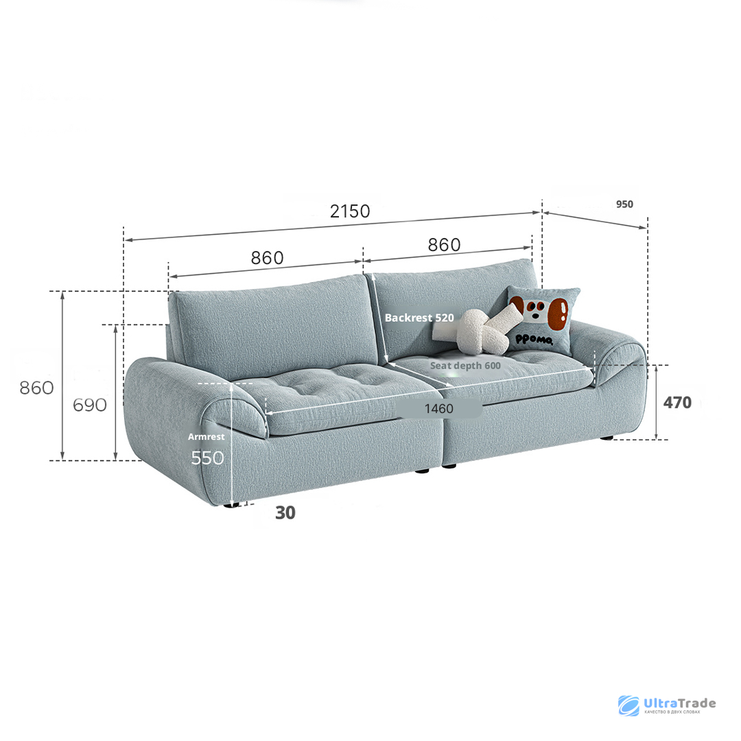 Высота спинки Высота спинки составляет 51 см — этого достаточно для комфортной поддержки шеи. Толщина подушек — 23 см, они мягкие и объемные, создавая ощущение погружения в облако. Увеличенная высота спинки обеспечивает дополнительный комфорт для головы и шеи. ![]() |