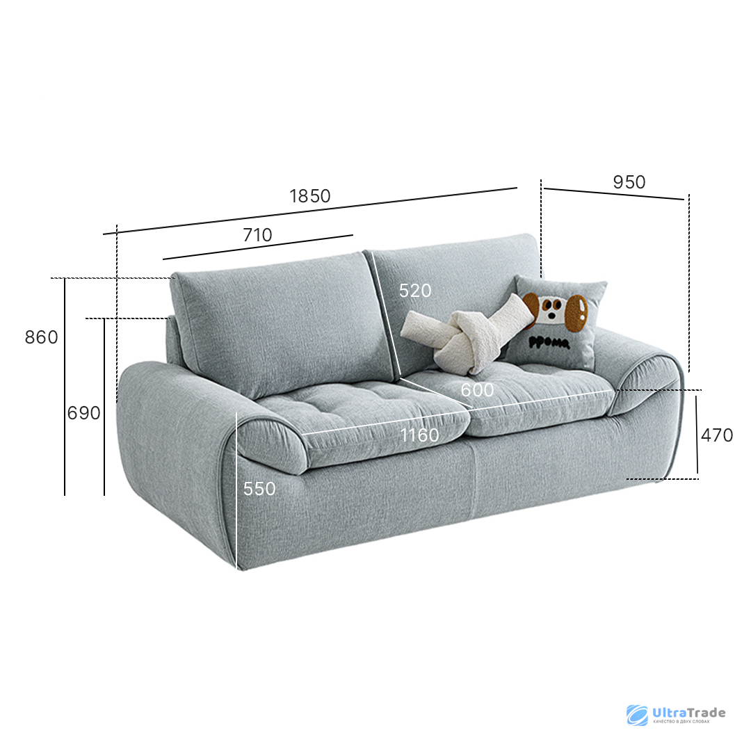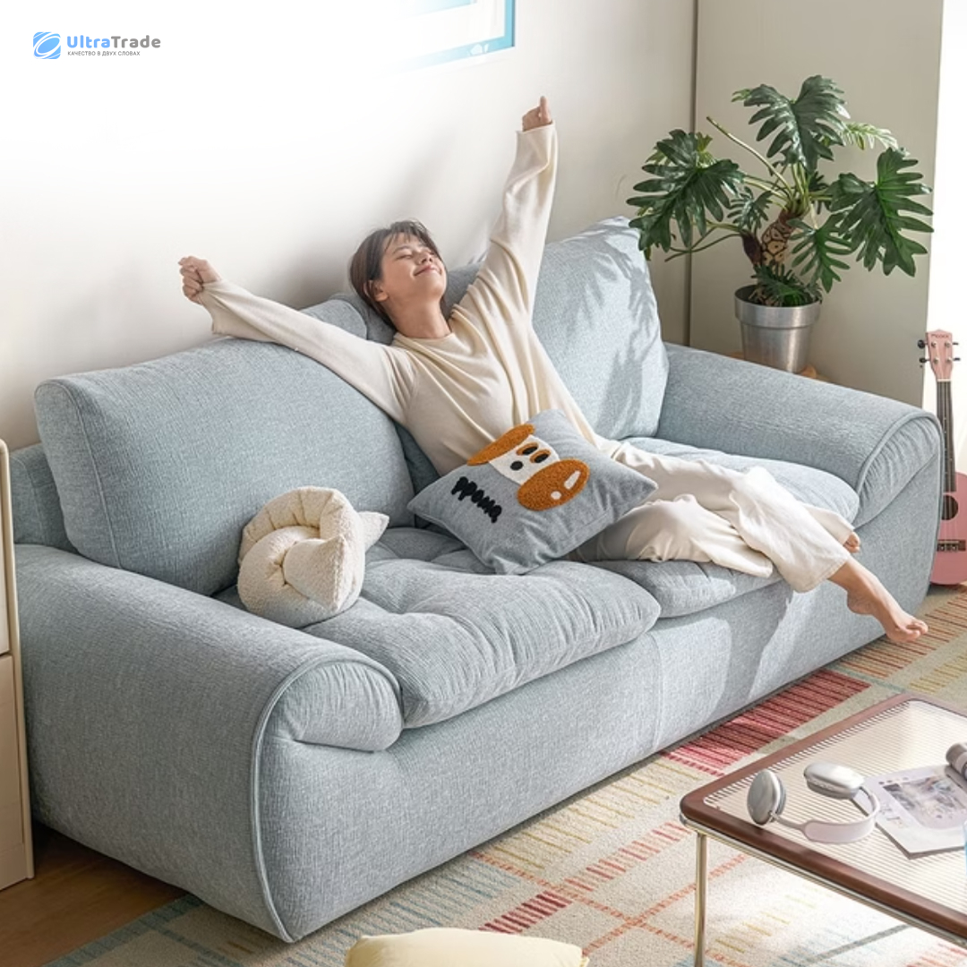 Высота спинки составляет 51 см — этого достаточно для комфортной поддержки шеи. Толщина подушек — 23 см, они мягкие и объемные, создавая ощущение погружения в облако. Увеличенная высота спинки обеспечивает дополнительный комфорт для головы и шеи.