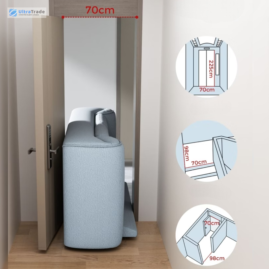 Диван адаптирован для сложных условий доставки: он может быть внесён через проёмы шириной 70 см — включая лифты (70 × 225 см), узкие лестницы (70 × 98 см) и повороты в прихожих.