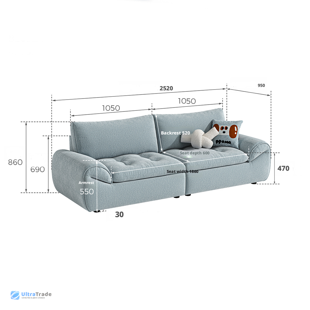 Высота спинки составляет 51 см — этого достаточно для комфортной поддержки шеи. Толщина подушек — 23 см, они мягкие и объемные, создавая ощущение погружения в облако. Увеличенная высота спинки обеспечивает дополнительный комфорт для головы и шеи.