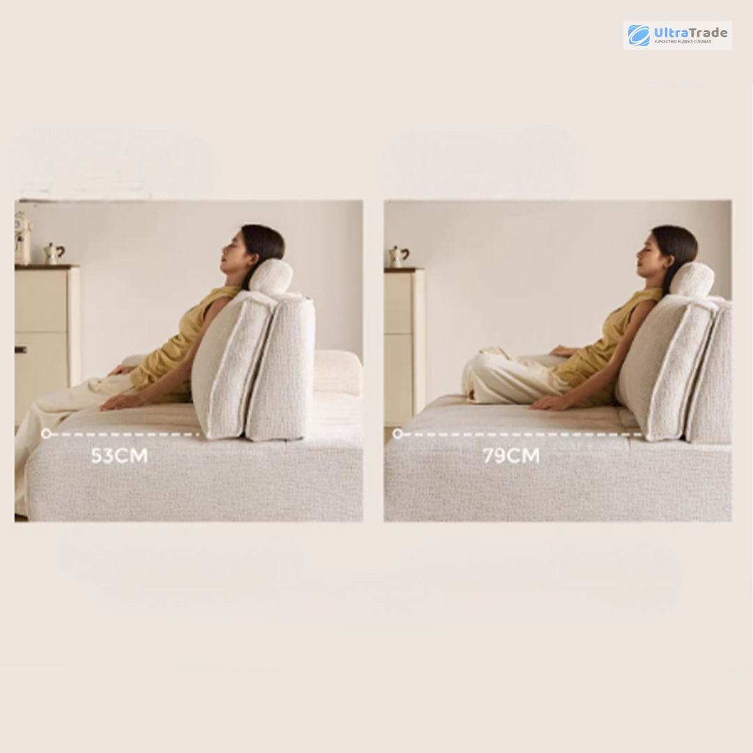 Спинка дивана Спинка дивана высокая и устойчивая, чтобы при откидывании человек мог опереться на неё полностью: голова и шея находятся в поддержке, а плечи не «зависают в воздухе». Спинка регулируется вперёд и назад: в переднем положении глубина сиденья — 53 см (удобно для чтения, игр с ребёнком), в заднем — 79 см (широкое, расширенное сиденье для полного расслабления). |