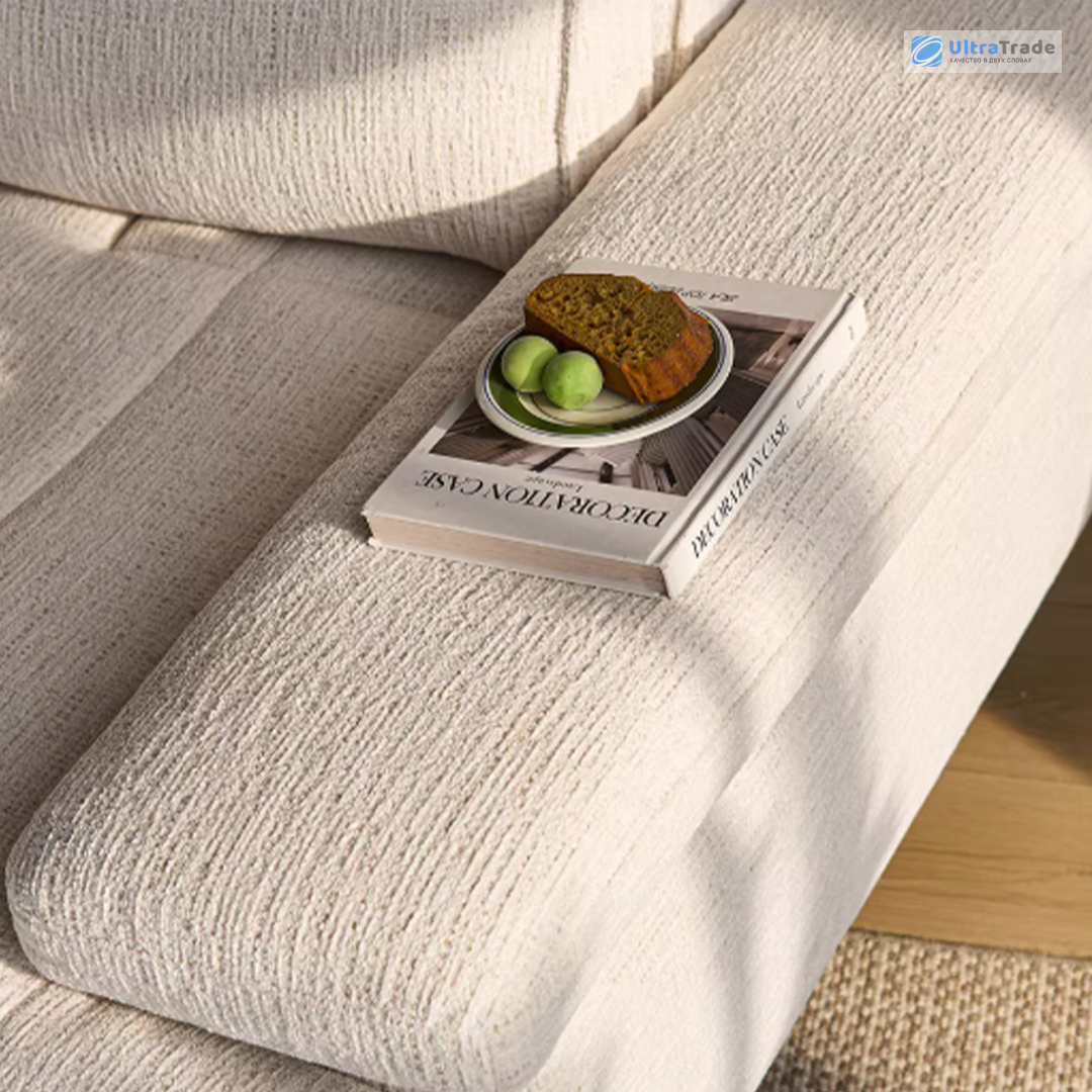 Подлокотники дивана имеют ровную поверхность, на которую можно положить книгу или тарелку с закусками. Такая конструкция превращает подлокотник в функциональную полку.