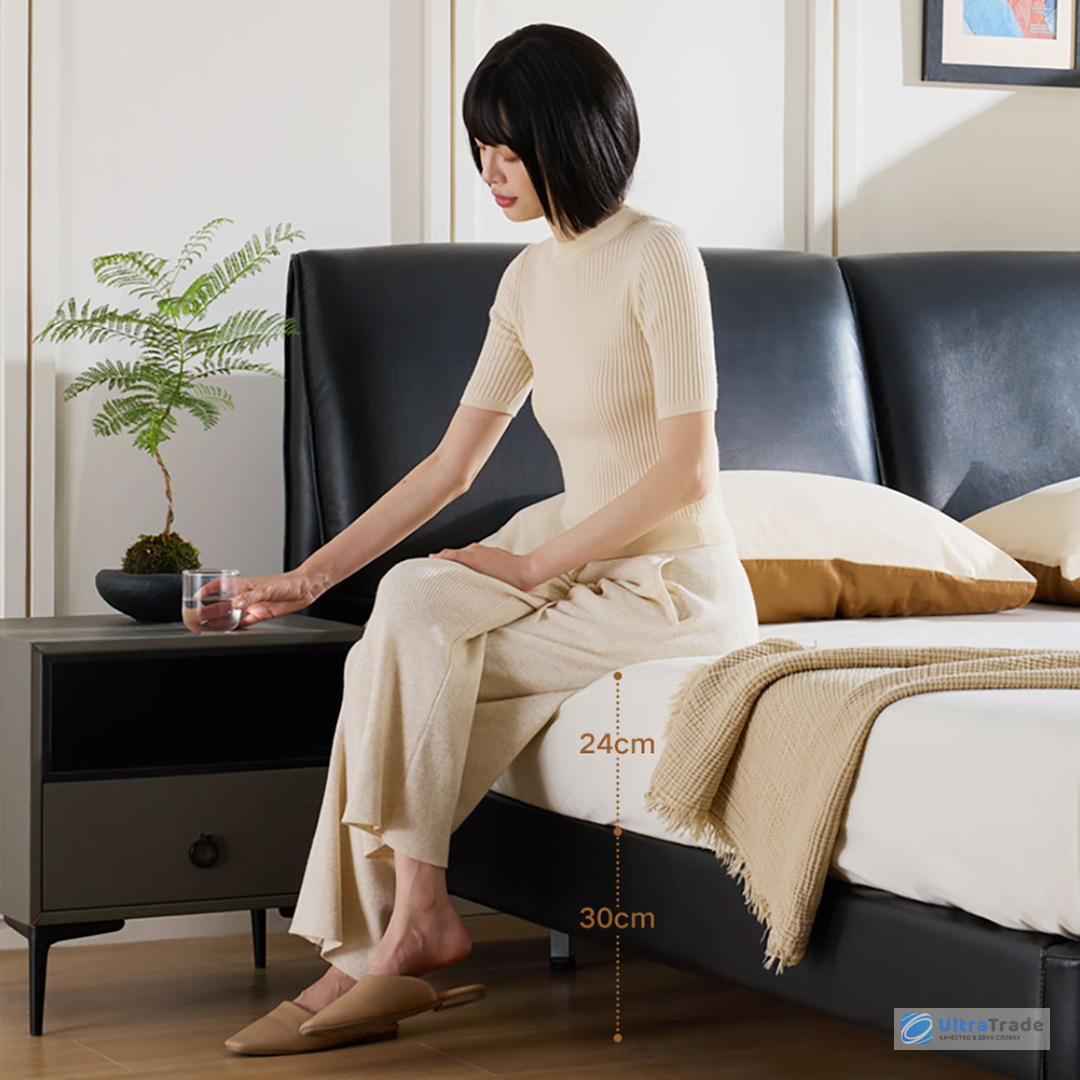 Ножки кровати скрыты внутри конструкции, создавая визуальный эффект лёгкого парения. Такое строение исключает выступающие углы, снижая риск случайных ушибов. Оптимальная высота для сидения (около 54 см) и рекомендуемая высота матраса (20–24 см).