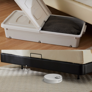 Кровать приподнята над полом на 15 см. Этого достаточно для свободного прохода робота-пылесоса. Такая высота также создаёт удобное пространство для хранения.