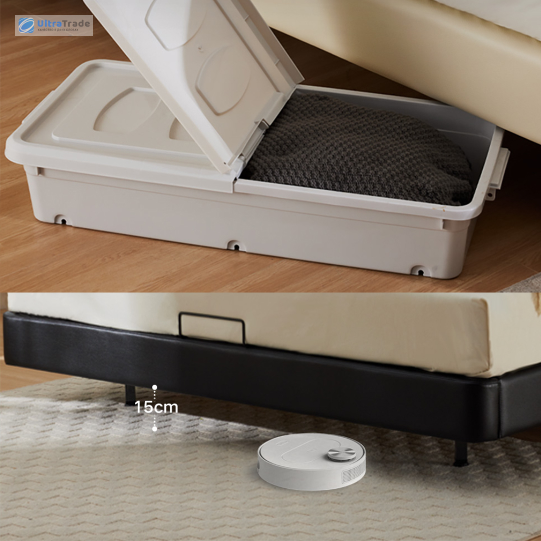 Кровать приподнята над полом на 15 см. Этого достаточно для свободного прохода робота-пылесоса. Такая высота также создаёт удобное пространство для хранения.