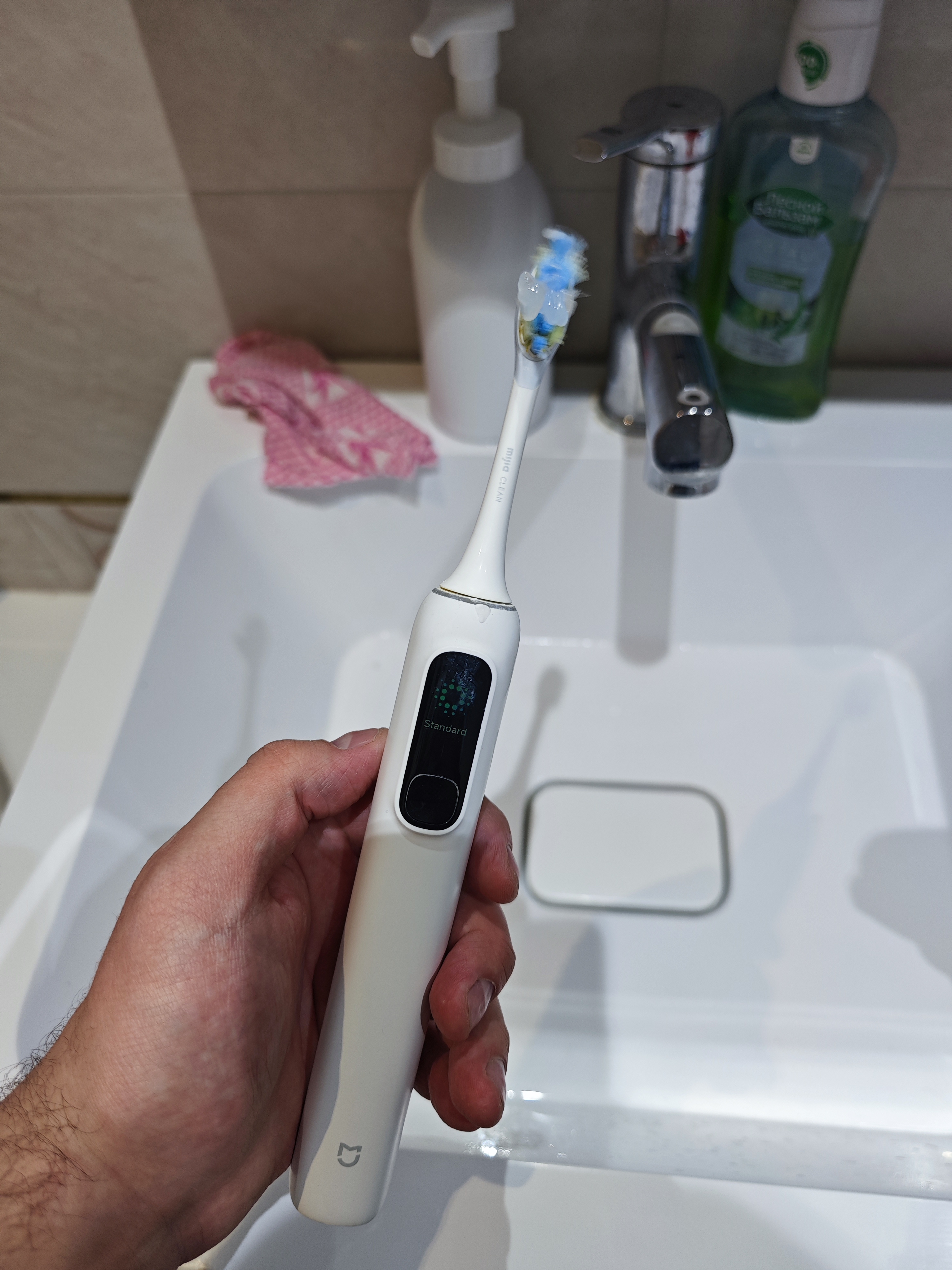 Щётка супер. Показывает в процессе чистки области, которые ты упустил. При сильном нажатии на зубы, сигналит и горит красный, чтобы не налягал сильно)