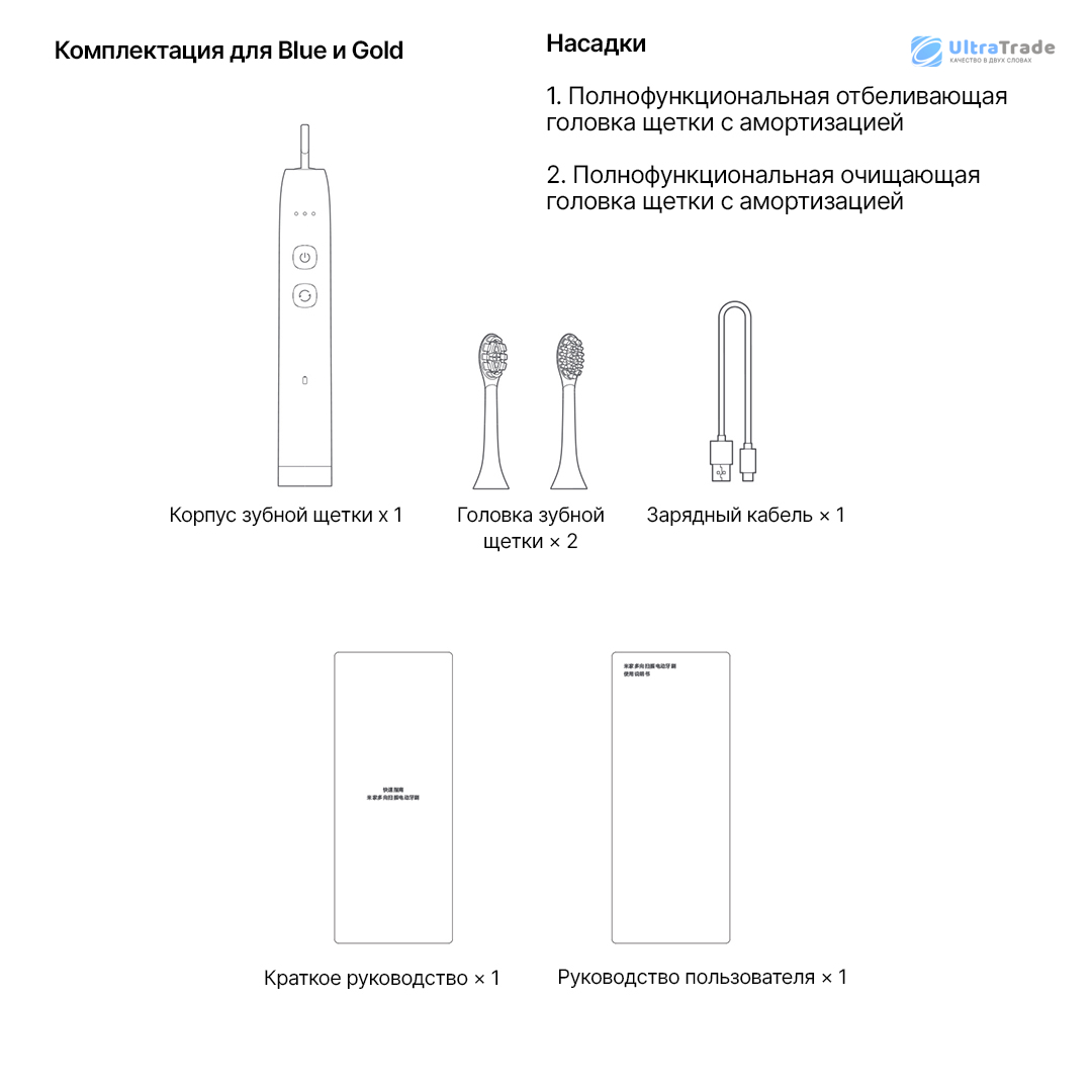 Комплектация: Щетка, насадка (2шт), зарядный кабель, инструкция, краткая инструкция
