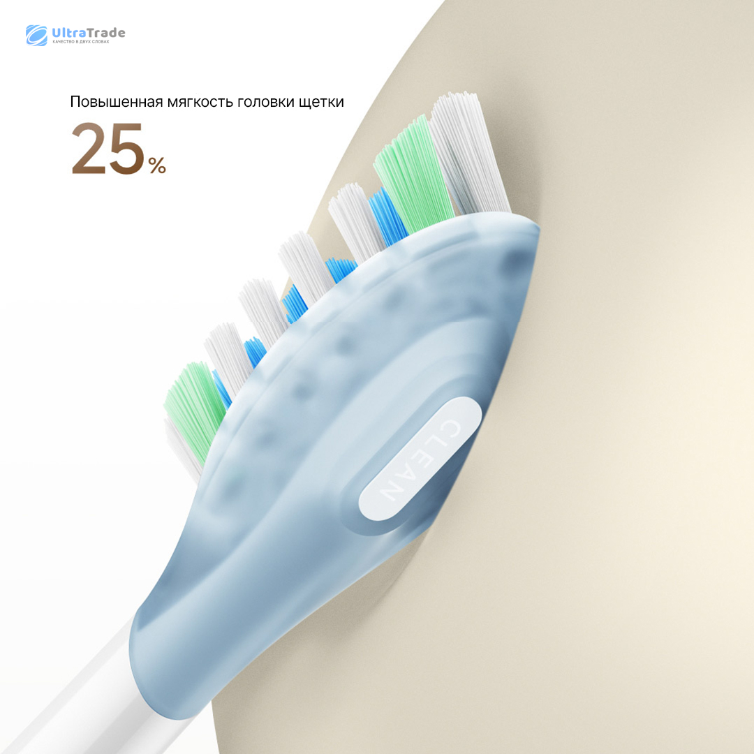 Насадка покрыта утолщенным мягким силиконом класса food-grade*, который эффективно амортизирует давление и предотвращает стук по зубам. Гибкость насадки увеличена на 25%, что делает её идеальной для чистки моляров и других труднодоступных участков. Инновационная конструкция с раздельным расположением щетинок в мягком силиконе повышает силу деформации в 3.9 раза, обеспечивая лучшее прилегание к зубу и проникновение в межзубные промежутки.