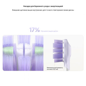 Насадка с полной амортизацией и гибкостью Насадка покрыта утолщенным мягким силиконом класса food-grade*, который эффективно амортизирует давление и предотвращает стук по зубам. Гибкость насадки увеличена на 25%, что делает её идеальной для чистки моляров и других труднодоступных участков. Инновационная конструкция с раздельным расположением щетинок в мягком силиконе повышает силу деформации в 3.9 раза, обеспечивая лучшее прилегание к зубу и проникновение в межзубные промежутки. |