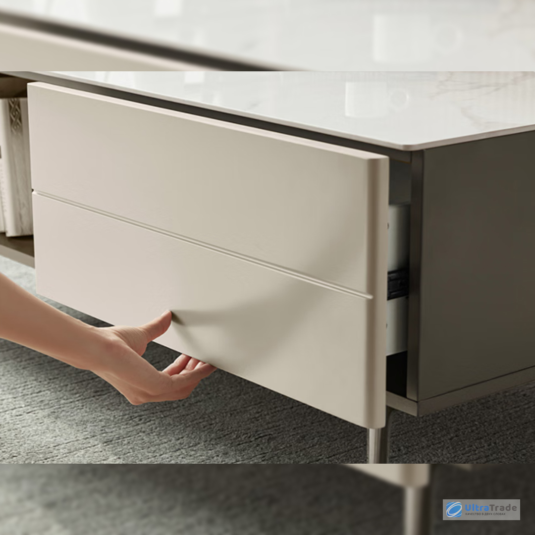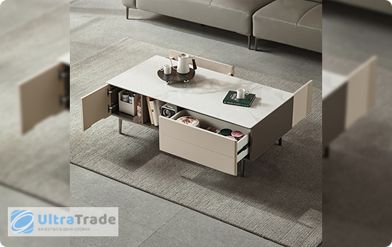 Хранение У этого журнального стола широкая столешница. Предусмотрены два закрытых отсека с дверцами для хранения вещей. Также есть два выдвижных ящика для мелких предметов. Такое сочетание в компактном изделии помогает поддерживать порядок в гостиной без лишних усилий. |