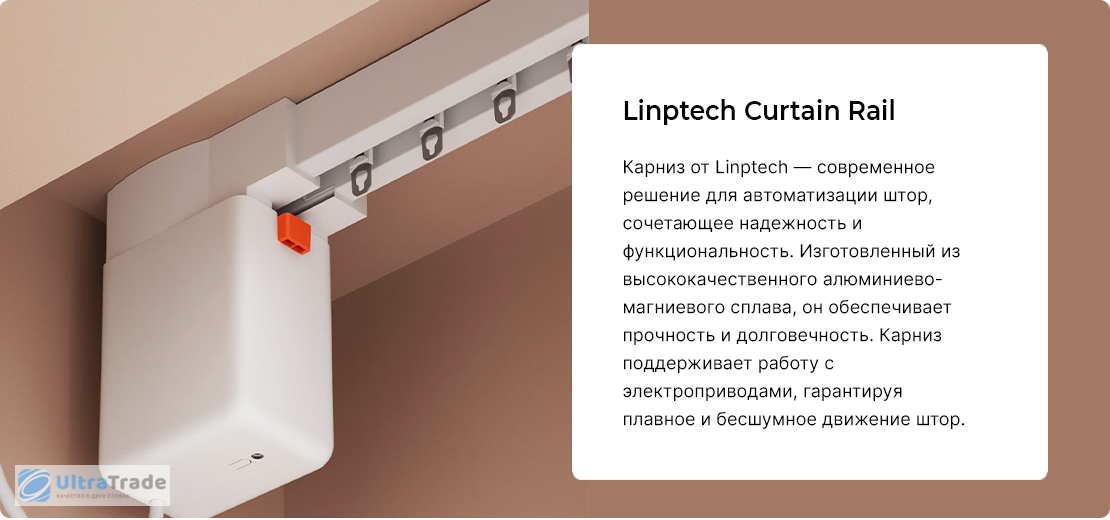 Карниз совместим с электроприводами Xiaomi Linptech моделей C5DB и CE1DB, которые поддерживают управление через MiHome благодаря Bluetooth Mesh 2.0, обеспечивают плавный ход штор со скоростью от 4 до 14 см/с (C5DB) или от 1 до 14 см/с (CE1DB).