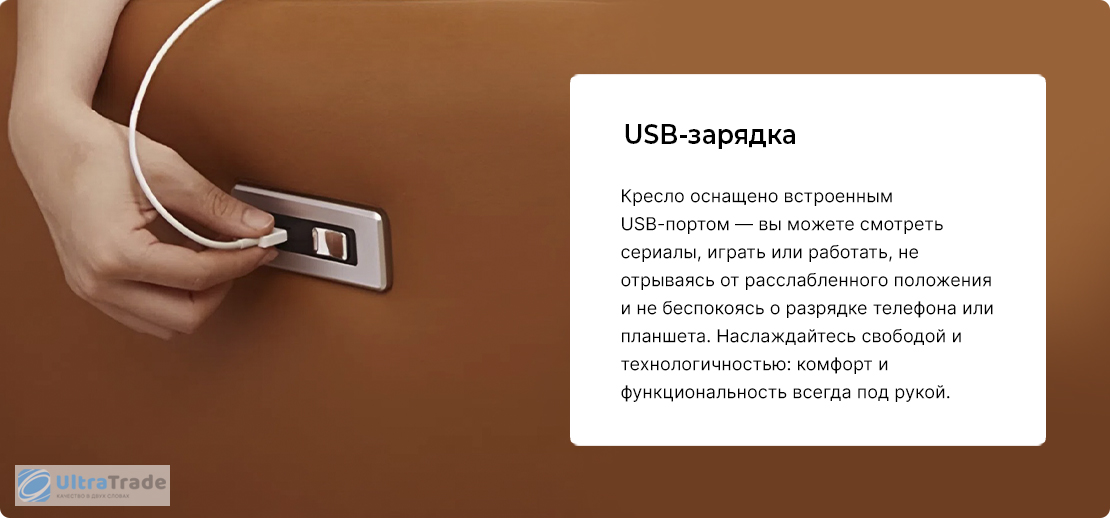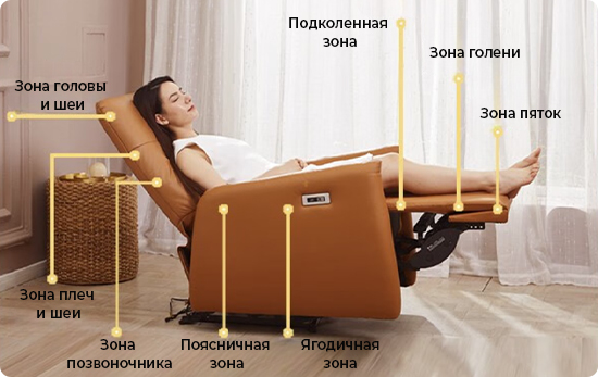 Кресло разработано с учётом принципов эргономики — его электропривод регулирует угол наклона спинки и подставки для ног, чтобы снять напряжение с позвоночника и мышц после долгого дня.