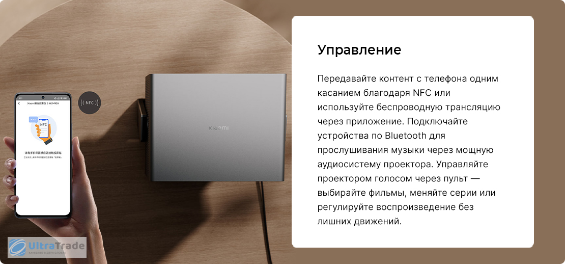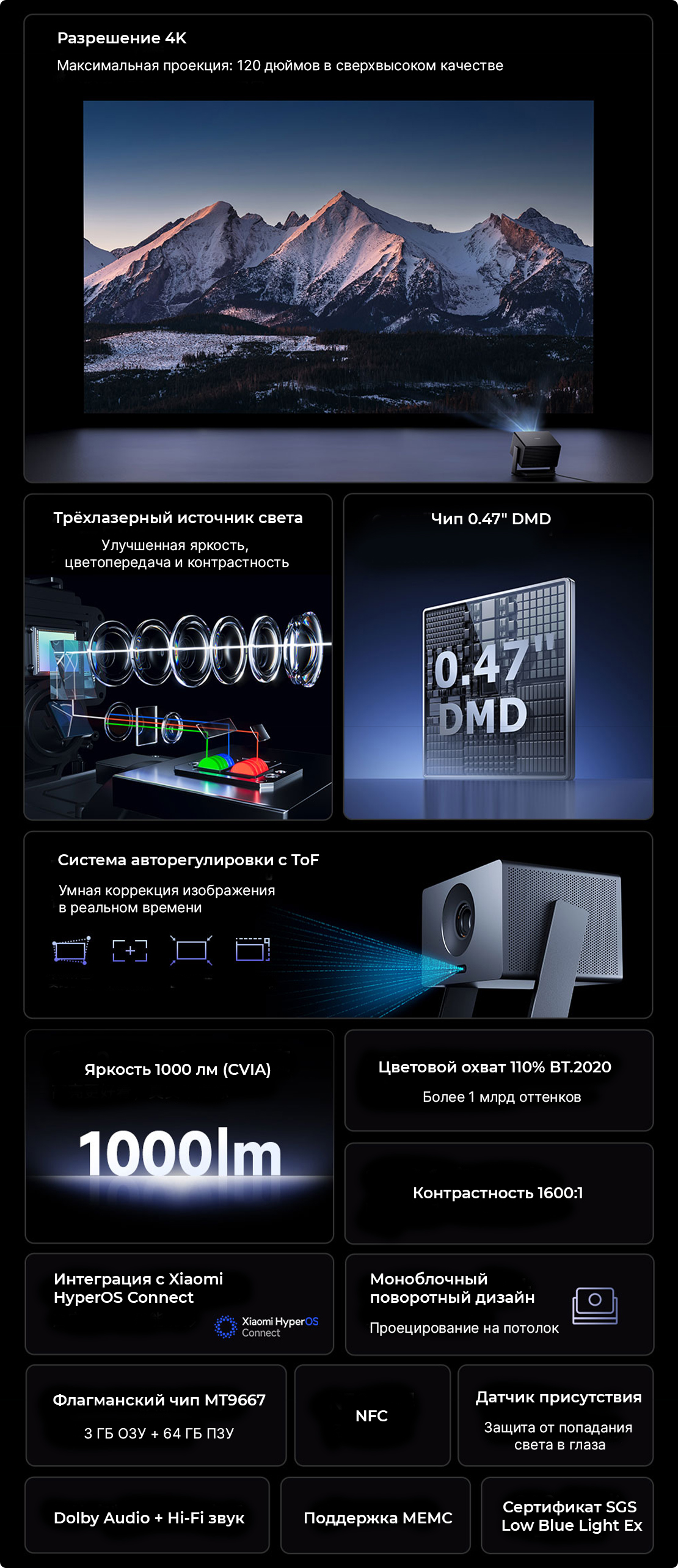 Проектор поддерживает экосистему Xiaomi HyperOS Connect, позволяя создавать персонализированные сценарии. Вы можете настроить автоматическое взаимодействие с умными светильниками, карнизами и другими устройствами.