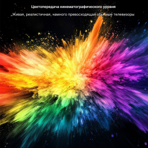 ![]() Высокая яркость и контраст Даже в светлой комнате изображение остаётся насыщенным, с глубокими тенями и яркими светами благодаря HDR10 и алгоритмам ИИ для повышения динамического диапазона. Яркость: 2600 ISO. Контрастность: 1600:1. |