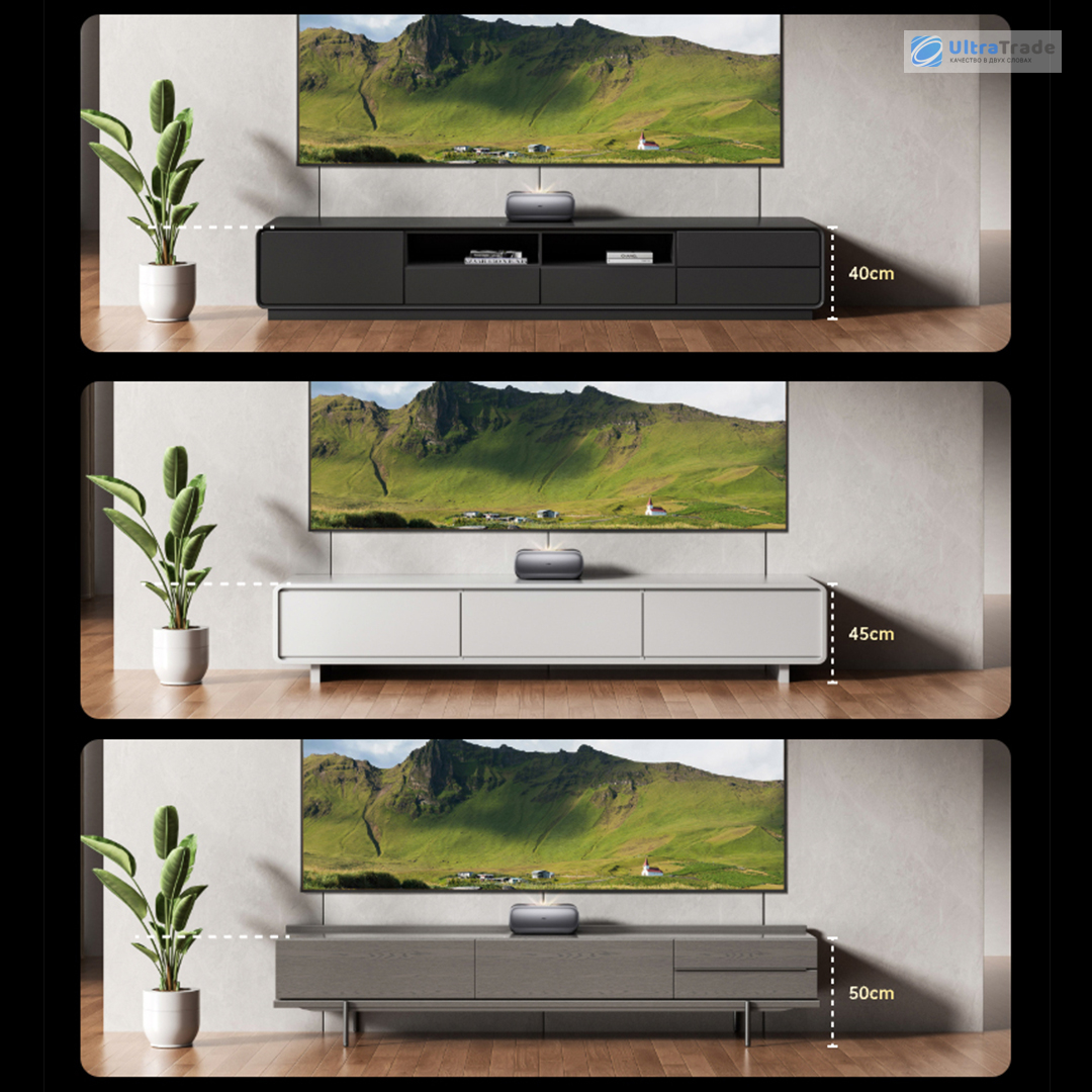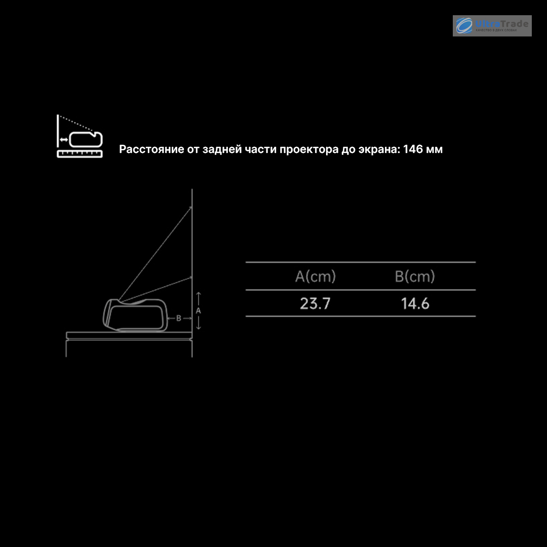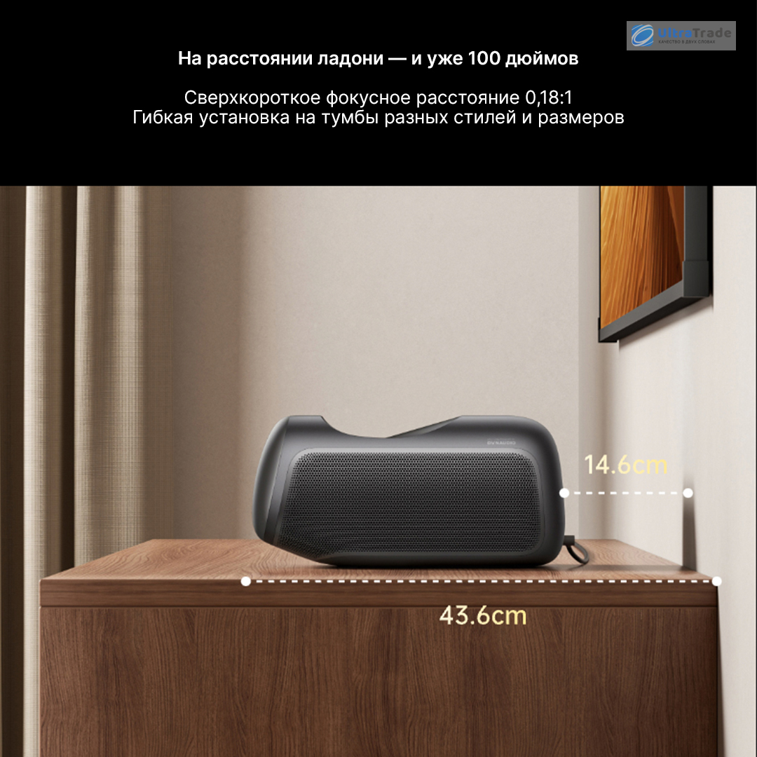 Сверхкороткое фокусное расстояние Фокусное расстояние 0,18:1 позволяет получить 100-дюймовое изображение, установив проектор всего в 14,6 см от экрана. Это идеально для небольших комнат и стандартных тумб под ТВ. ![]() |