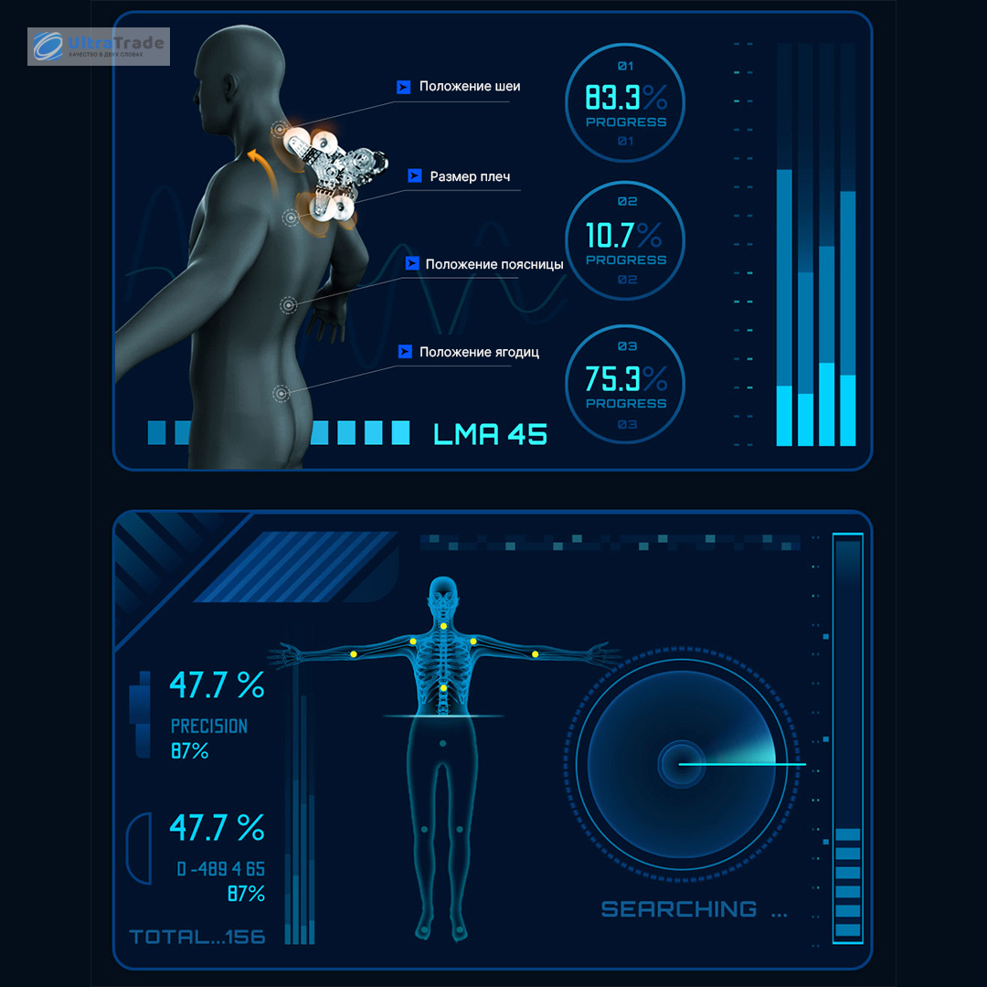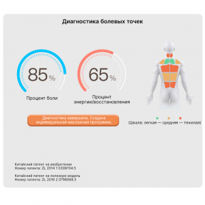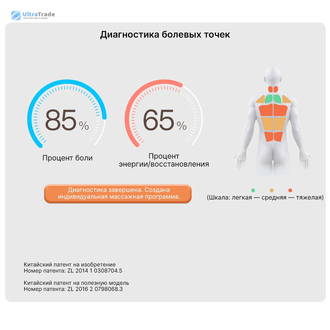 ![]() Интеллектуальная диагностика Кресло оснащено 20 датчиками Холла, которые сканируют рост, телосложение и изгиб спины, точно определяя положение плеч, поясницы и ягодиц. Интеллектуальный алгоритм на основе ИИ анализирует болевые точки и создаёт индивидуальную программу массажа. |
