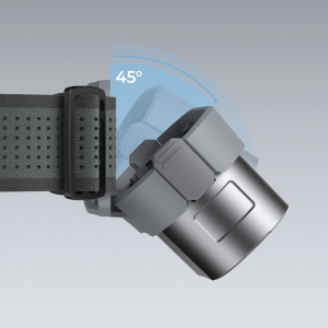 Головная часть фонаря легко наклоняется на угол до 45° вверх или вниз. Это позволяет точно направить луч света именно туда, куда нужно — на рабочую поверхность, тропу перед собой или в палатку.