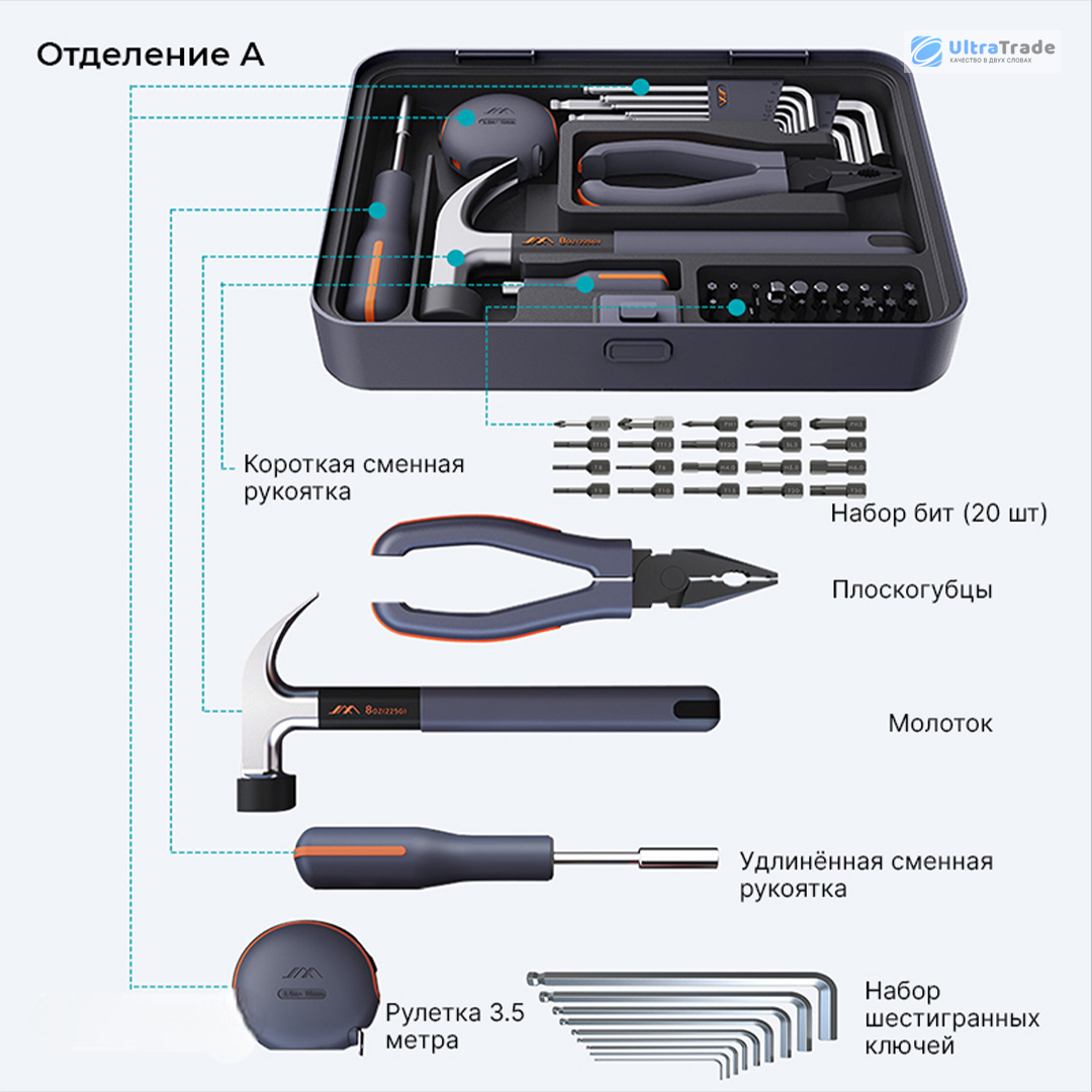 Отделение A Отделение A включает в себя основные ручные инструменты. В этот слой входят плоскогубцы, молоток-гвоздодер и набор отверток, включая 20 наборов бит. Также здесь находится набор шестигранников. Дополняет этот набор рулетка длиной 3.5 метра, что делает его идеальным для различных измерений. |