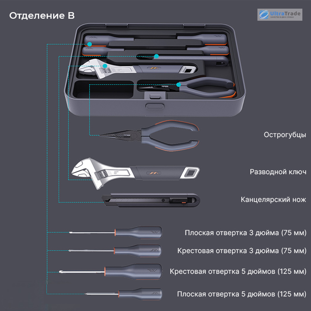![]() Отделение B Отделение B содержит такие инструменты как плоскогубцы, разводной ключ и универсальный нож. Набор отверток в этом слое включает 3-дюймовые и 5-дюймовые шлицевые и крестовые отвертки, что позволяет работать с большим количеством разных крепежей. |