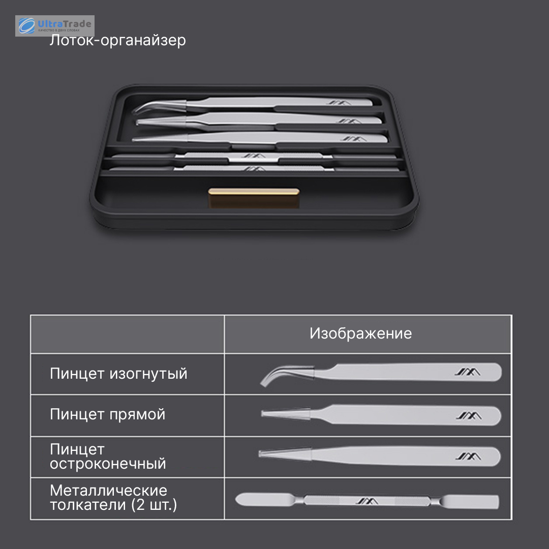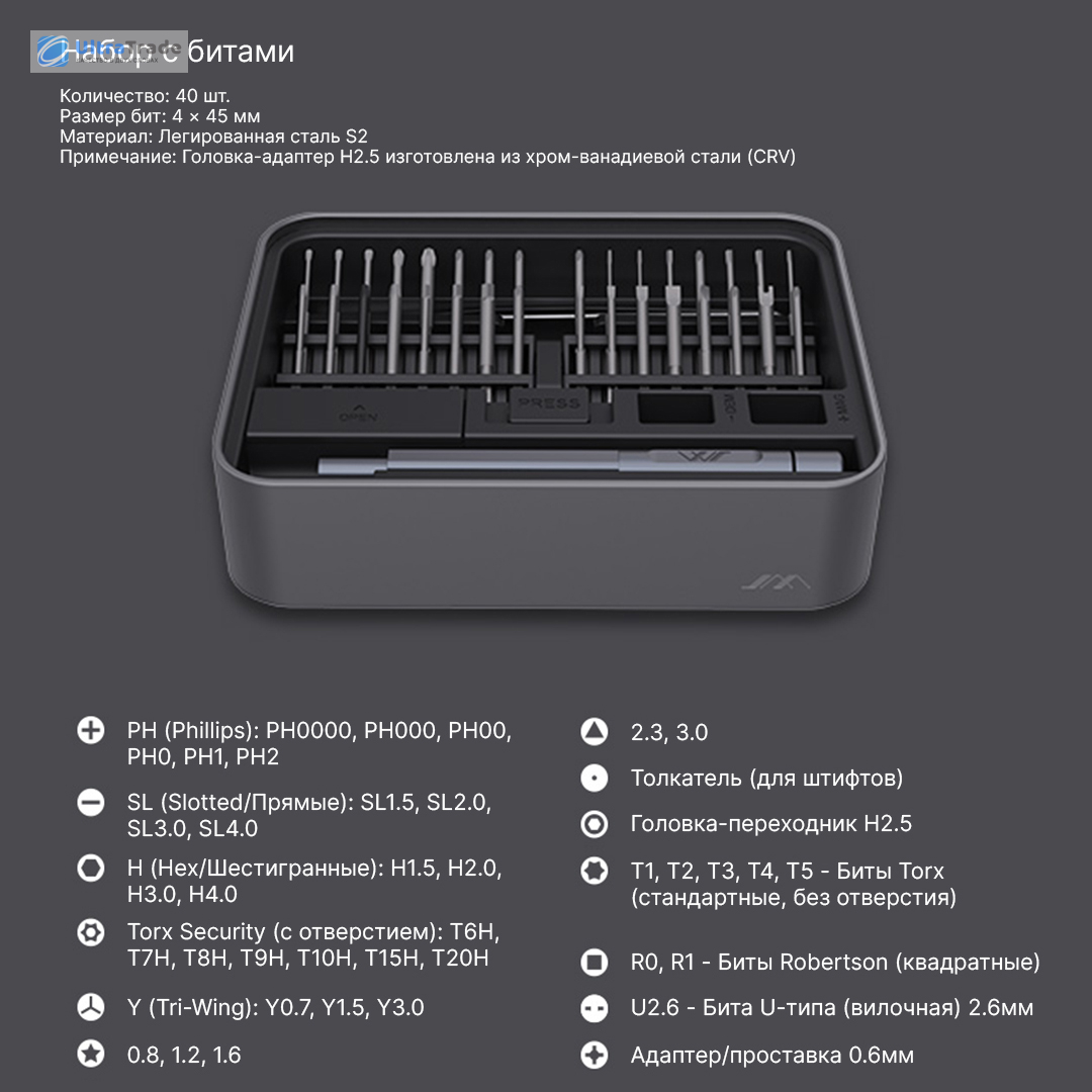 FM2 — Комплект для точной работы с мелкими деталями Это универсальное решение для ремонта электроники, смартфонов и других устройств с мелкими компонентами. В комплект входит магнитная доска, которая надежно удерживает металлические детали, предотвращая их потерю во время работы. Комплект также включает лоток-органайзер с пинцетами: изогнутым, прямым, остроконечным и двумя металлическими толкателями. Эти инструменты позволяют точно манипулировать мелкими деталями, обеспечивая высокую точность при сборке или разборке. Центральным элементом является набор бит из легированной стали S2, который включает 40 штук различных типов: от крестовых (PH) до специализированных (Torx Security, Tri-Wing). Все биты имеют размер 4 × 45 мм и изготовлены из прочного материала, что гарантирует долговечность и надежность. *Подробнее о составе набора можно узнать в закладке "Габариты". |