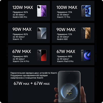 ![]() HyperCharge Зарядная станция поддерживает технологию Xiaomi HyperCharge мощностью до 120 Вт и позволяет одновременно заряжать два устройства (например, смартфоны или планшеты) на мощности до 67 Вт каждое. Для зарядки используется встроенный кабель Type-C1 и порт Type-C2. |