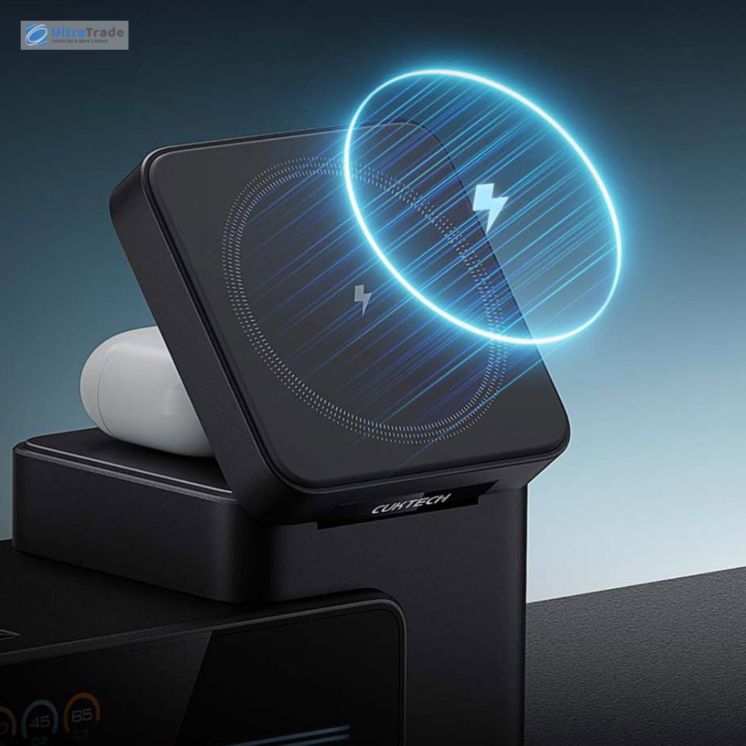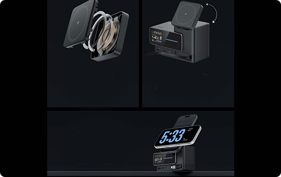 Беспроводная зарядка Модель идеально впишется в любой интерьер рабочего стола. Располагайте устройство горизонтально или вертикально для комфортного просмотра контента — оно поддерживает режим Standby на iPhone. Режим Standby требуется iOS 17 и выше. Специальная откидная беспроводная панель мощностью до 15 Вт оснащена надёжными магнитами уровня N52. Усилие сцепления около 10 Н и шарнир с углом наклона до 60° обеспечивают надёжную фиксацию и удобный просмотр. Конструкция прошла более 10 000 циклов испытаний на открывание и закрывание. Для работы функции беспроводной зарядки требуется её поддержка аппаратной частью телефона. Устройства Apple с функцией MagSafe должны использоваться без чехла или с совместимым магнитным чехлом. Для устройств Android потребуется магнитный чехол того же бренда. Устройства Apple поддерживают мощность беспроводной зарядки до 7,5 Вт MAX. |