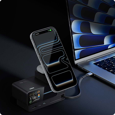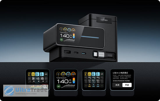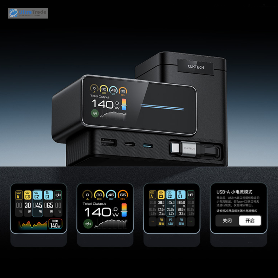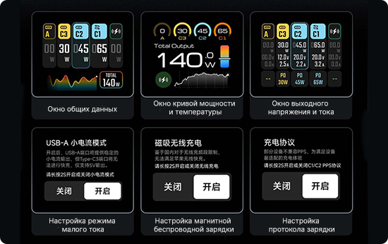 Экран Наслаждайтесь полным контролем над процессом зарядки благодаря информативному 1,83-дюймовому TFT-экрану. Он детально отображает ключевые параметры, включая общую статистику, кривую мощности, температуру, а также напряжение и силу тока на каждом порту. Экран также служит интеллектуальной панелью управления. С его помощью вы можете включать и выключать функцию магнитной беспроводной зарядки, активировать режим малого тока для USB-A порта, а также управлять поддержкой протокола PPS на портах C1 и C2 для оптимальной совместимости с различными устройствами. |