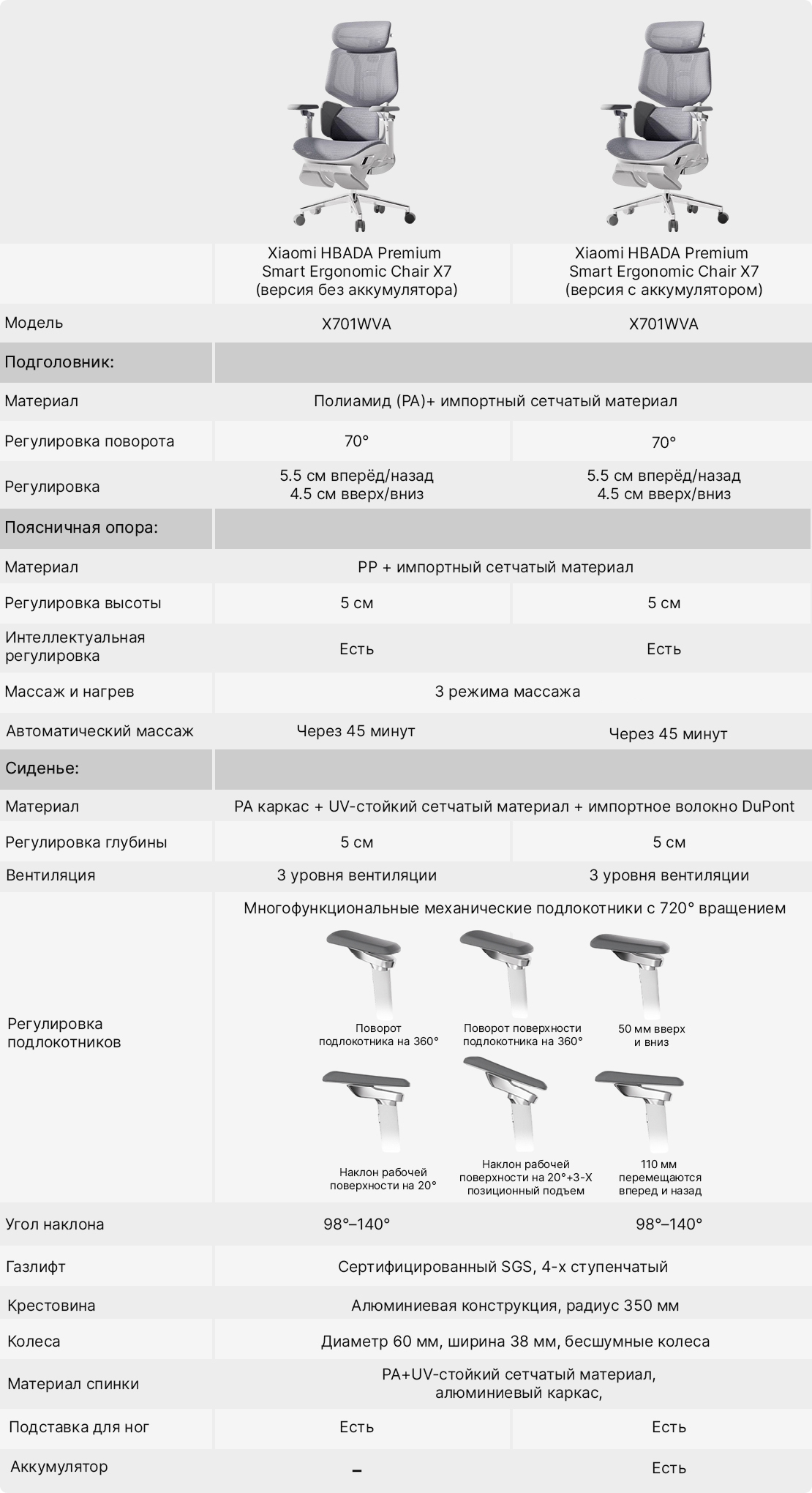 Подлокотники вращаются на 360°, регулируются по высоте на 50 мм и имеют наклон рабочей поверхности до 20°. Трехпозиционный подъем и горизонтальная регулировка на 110 мм обеспечивают точную настройку под любую позу.