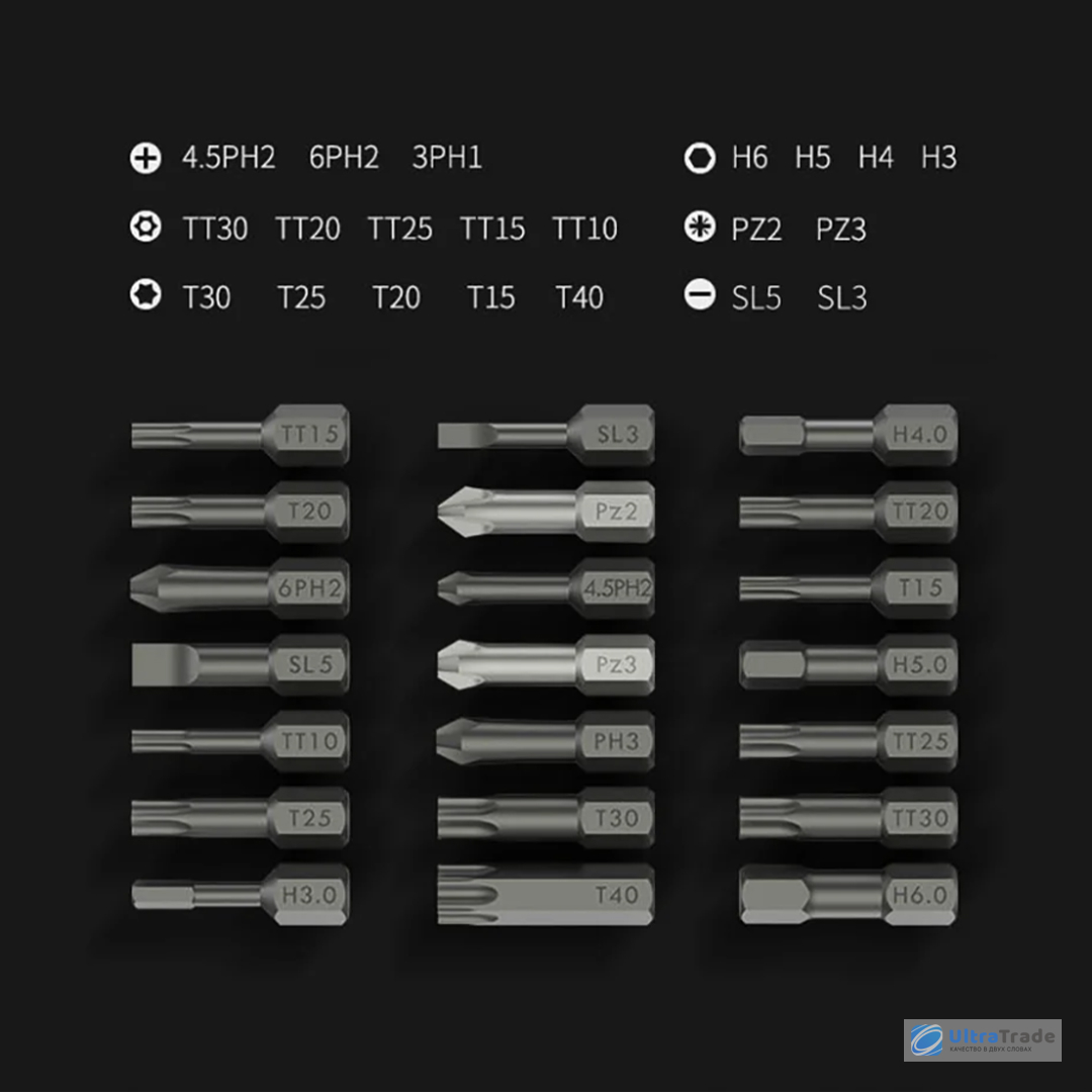Рукоятка отвёртки х1 шт Удлинитель х1 шт Биты х21 шт |
