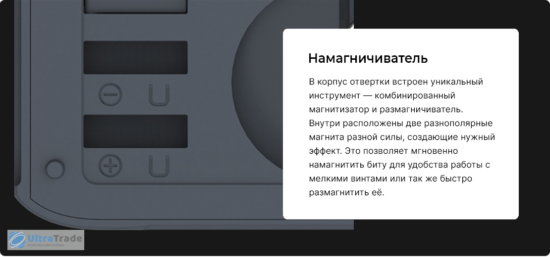 ![]() Магнит Головка инструмента оснащена мощным неодимовым магнитом. Он надежно удерживает биту и передает намагниченность на самый кончик, что значительно облегчает работу. |