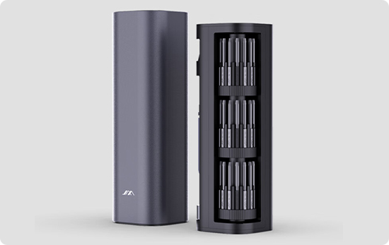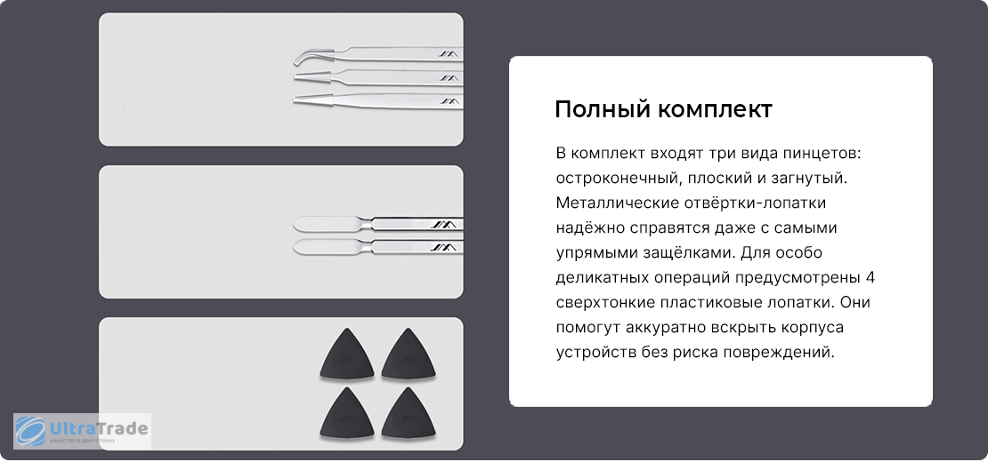 Телескопическая ручка ×1 Средняя алюминиевая отвёртка ×1 Пинцет с острым наконечником ×1 Пинцет с плоским наконечником ×1 Пинцет с загнутым наконечником ×1 Металлические лопатки ×2 Удлинённый стержень-игла ×1 Пластиковые лопатки ×4 Биты 4 мм (S2) ×42 Демагнитизатор ×1 Чехол для переноски ×1 |