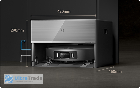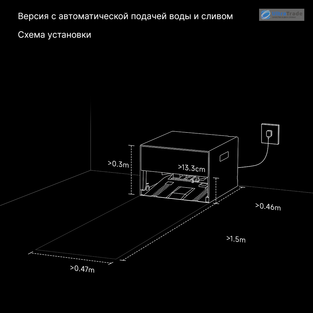 Ультратонкая база высотой всего 29 см легко встраивается под раковину или в шкаф на балконе. Она автоматически набирает чистую воду, сливает грязную и добавляет моющее средство — никакого ручного участия не требуется. В комплекте идут все необходимые шланги и фитинги для подключения к стандартному крану. Уборка становится полностью автономной: робот сам следит за уровнем воды и чистотой салфетки. |