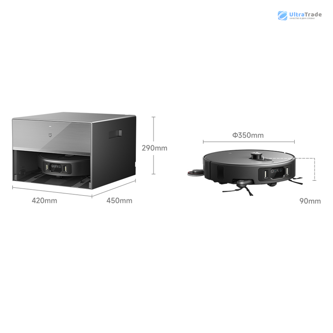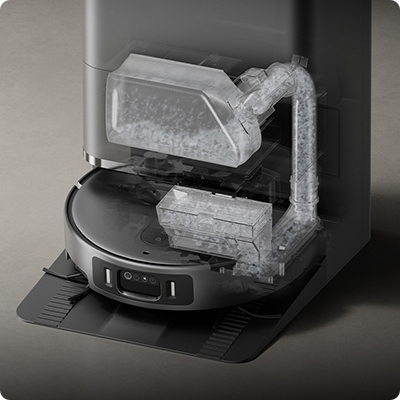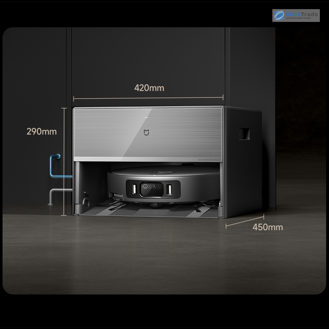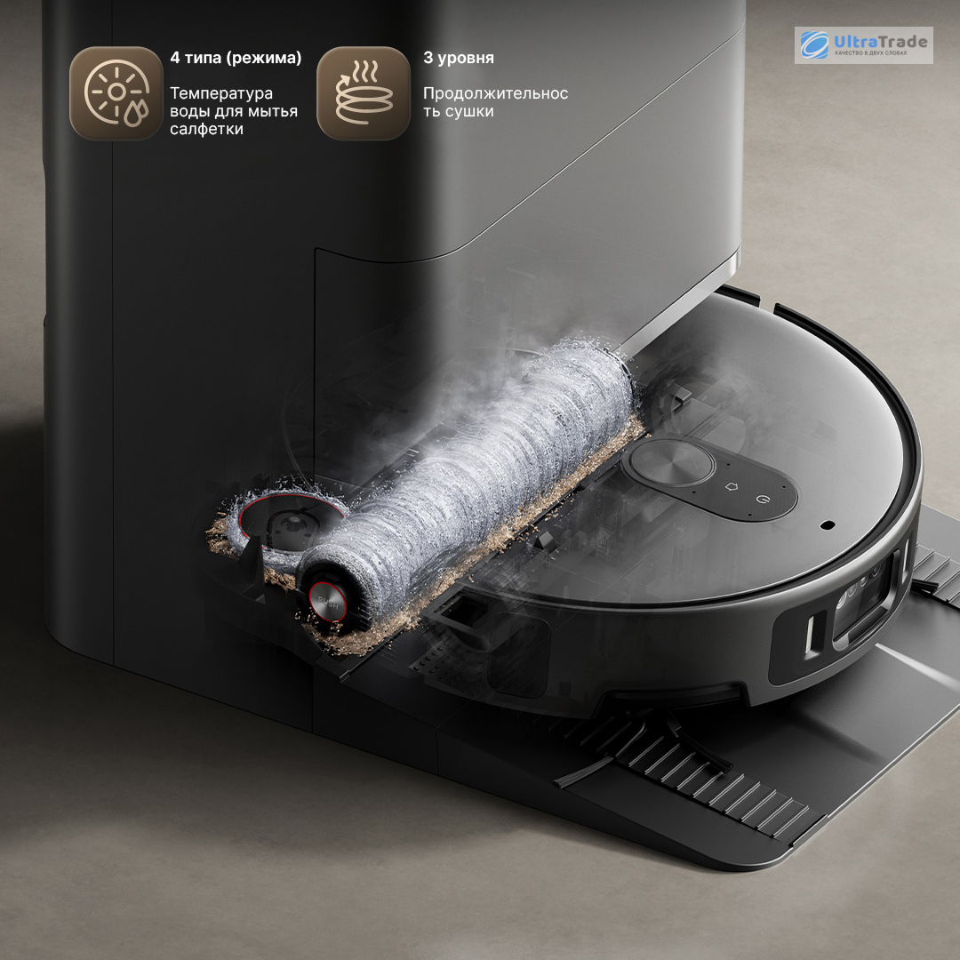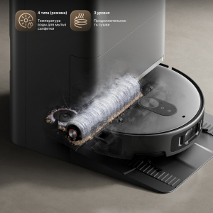 Идеально подходит для квартир без возможности подключения к коммуникациям. База включает отдельные ёмкости для чистой и грязной воды, а также встроенный модуль подавления запахов в баке для стоков — неприятные ароматы не появляются до 40 дней. Робот самостоятельно моет салфетку горячей водой 85°С и сушит её горячим воздухом 50°С. Мусор из контейнера перекачивается в герметичный пылесборный мешок, который достаточно менять раз в 75 дней.