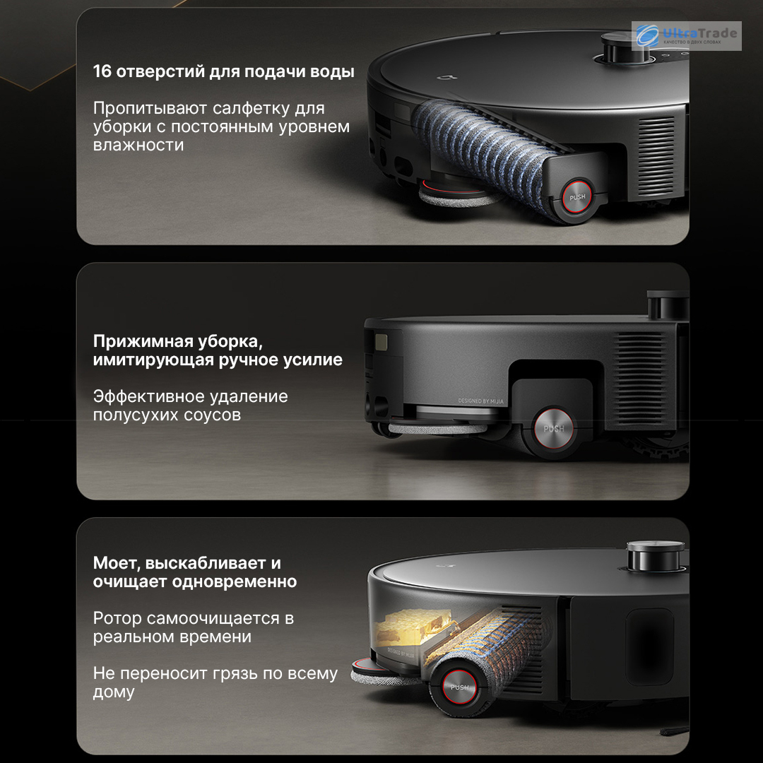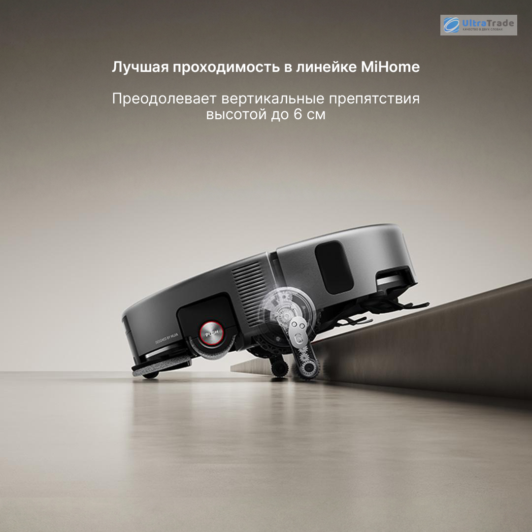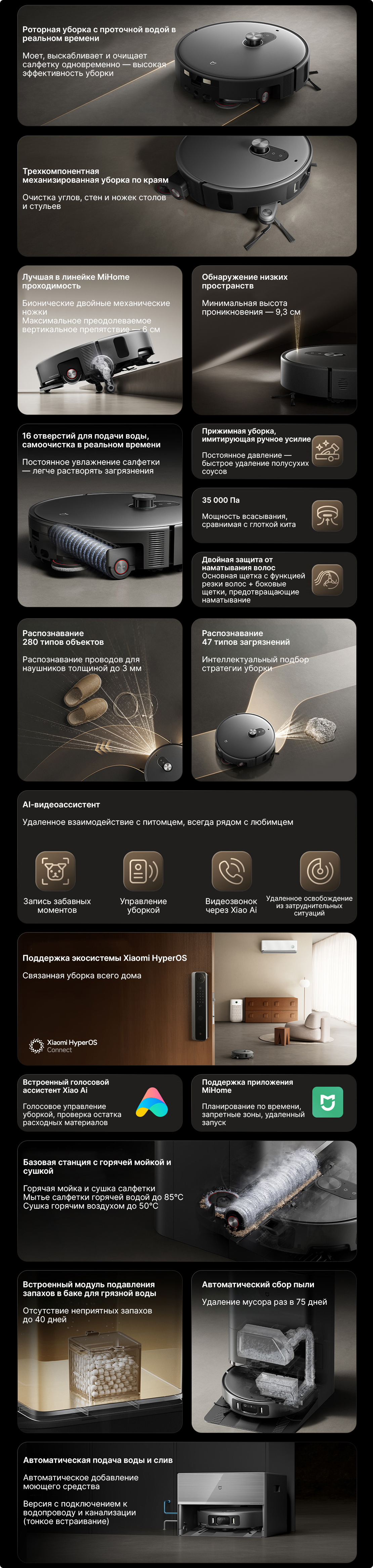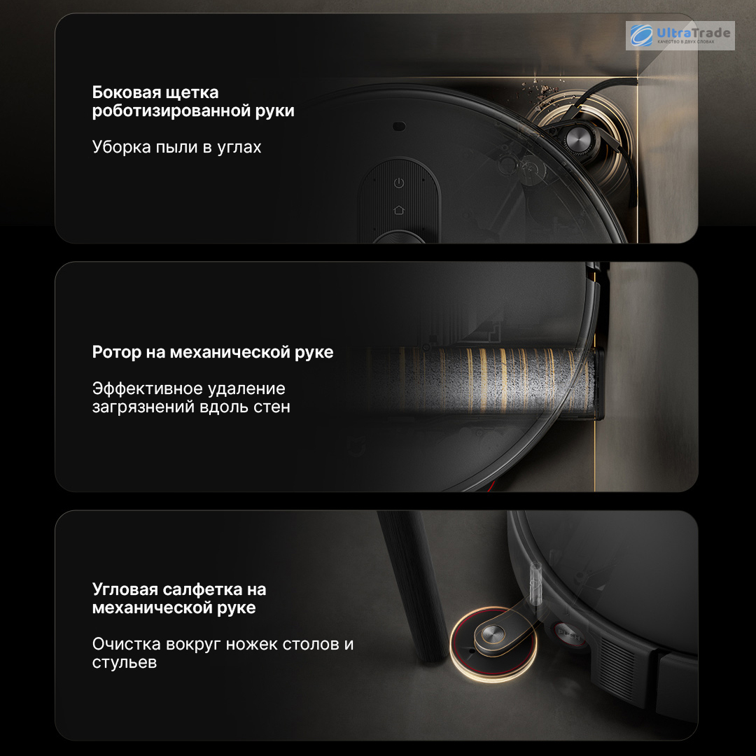 Уборка вдоль стен, углов и ножек мебели Гибкие выдвижные элементы с салфетками плотно прилегают к стенам, углам и ножкам мебели, убирая пыль в зонах, куда не достают обычные роботы. Ротор на механической руке и угловая салфетка работают синхронно с боковыми щётками, обеспечивая миллиметровую точность уборки вдоль всех поверхностей — никаких «серых зон» вдоль плинтусов. Бионические двойные «ножки» позволяют преодолевать вертикальные препятствия высотой до 6 см — пороги между комнатами больше не граница. При уборке низких зон (под диванами, кроватями) лидар автоматически опускается, и робот заезжает в пространства высотой от 9,3 см. Даже на наклонных поверхностях он не застревает благодаря точному лазерному сканированию пространства впереди. |