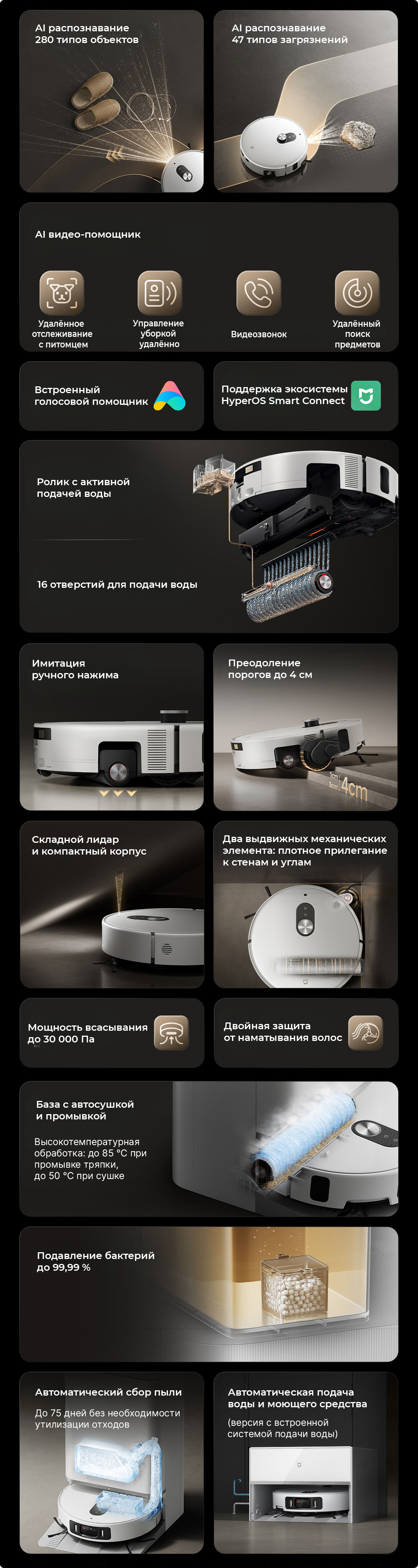 Распознавание препятствий Робот-пылесос использует AI-систему с тремя камерами, сертифицированной TÜV Rheinland. Точно различает 280 типичных препятствий. Система уверенно работает при ярком свете, в темноте и сложной обстановке, гарантируя безопасную навигацию без столкновений. ![]() |