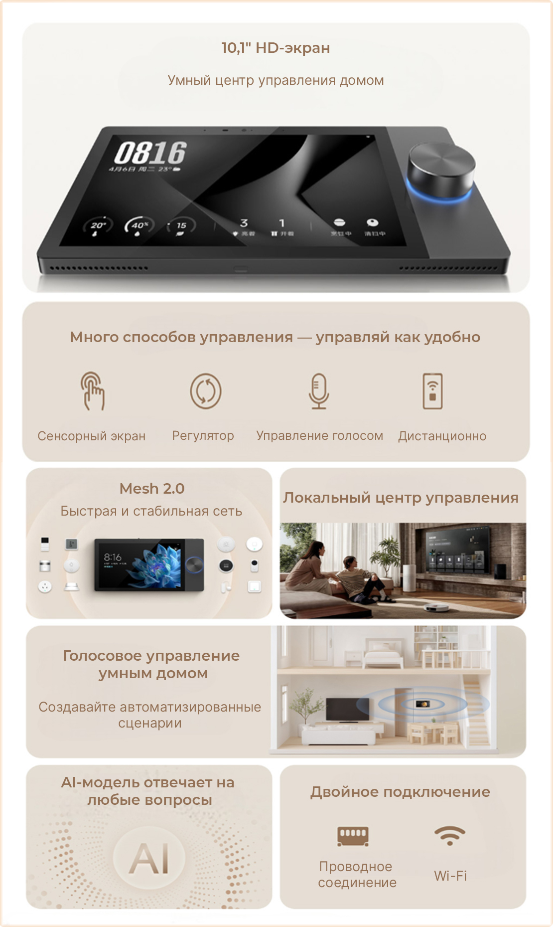 Умные сценарии, персонализация и визуализация Система позволяет создавать персонализированные режимы для разных ситуаций — будь то просмотр фильмов, приём гостей или ночной отдых. Вы можете независимо управлять тремя зонами освещения в гостиной и столовой, создавая идеальную атмосферу для каждого момента. Панель отображает состояние всех устройств в режиме реального времени. Через приложение MiHome вы можете загружать семейные фотографии, создавая тёплую и персональную заставку для экрана. Ультразвуковой датчик панели автоматически распознает ваше приближение и мгновенно включается. |