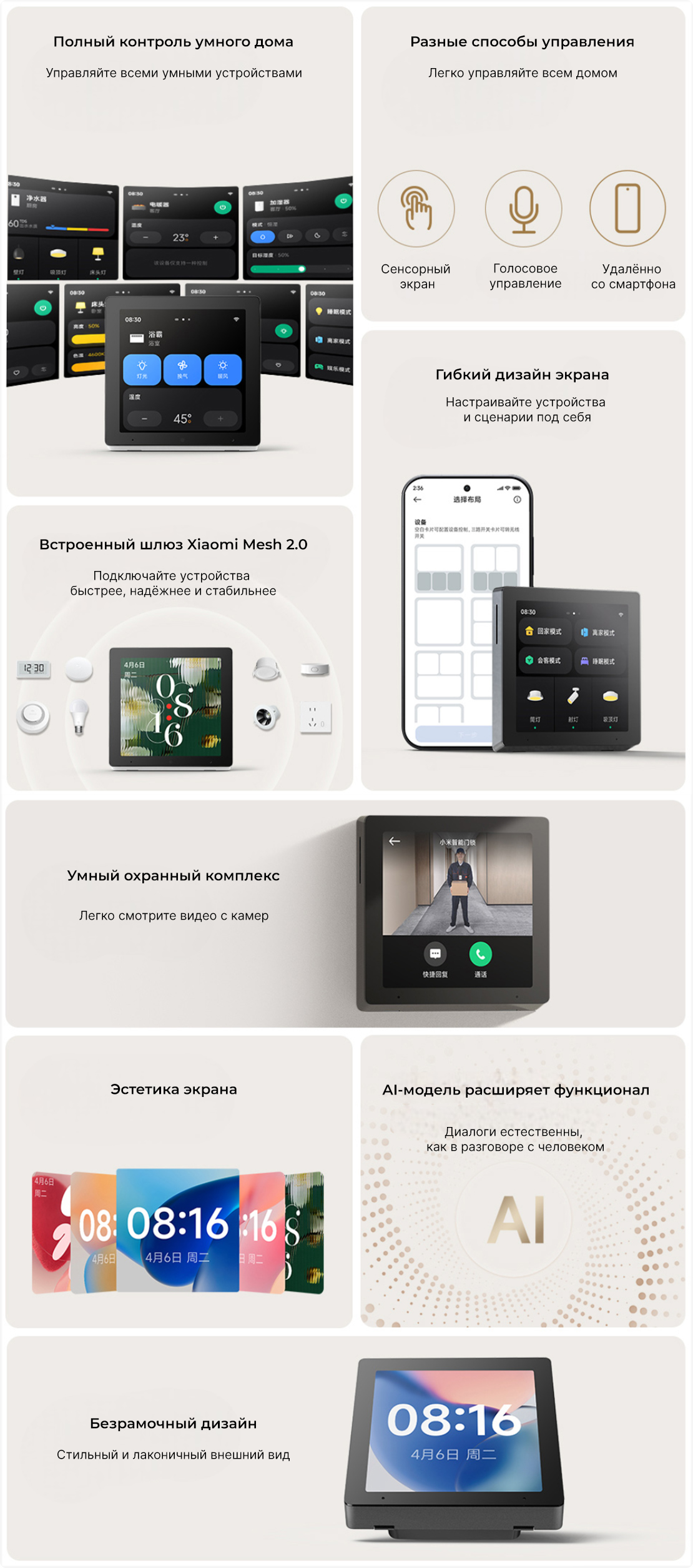 Центр управления Сенсорная панель управляет всем умным домом на системе Xiaomi HyperOS, которая упрощает контроль даже за сложной сетью устройств. Панель поддерживает более 5500 совместимых устройств, и к одному хабу можно подключить до 48 из них одновременно. ![]() |