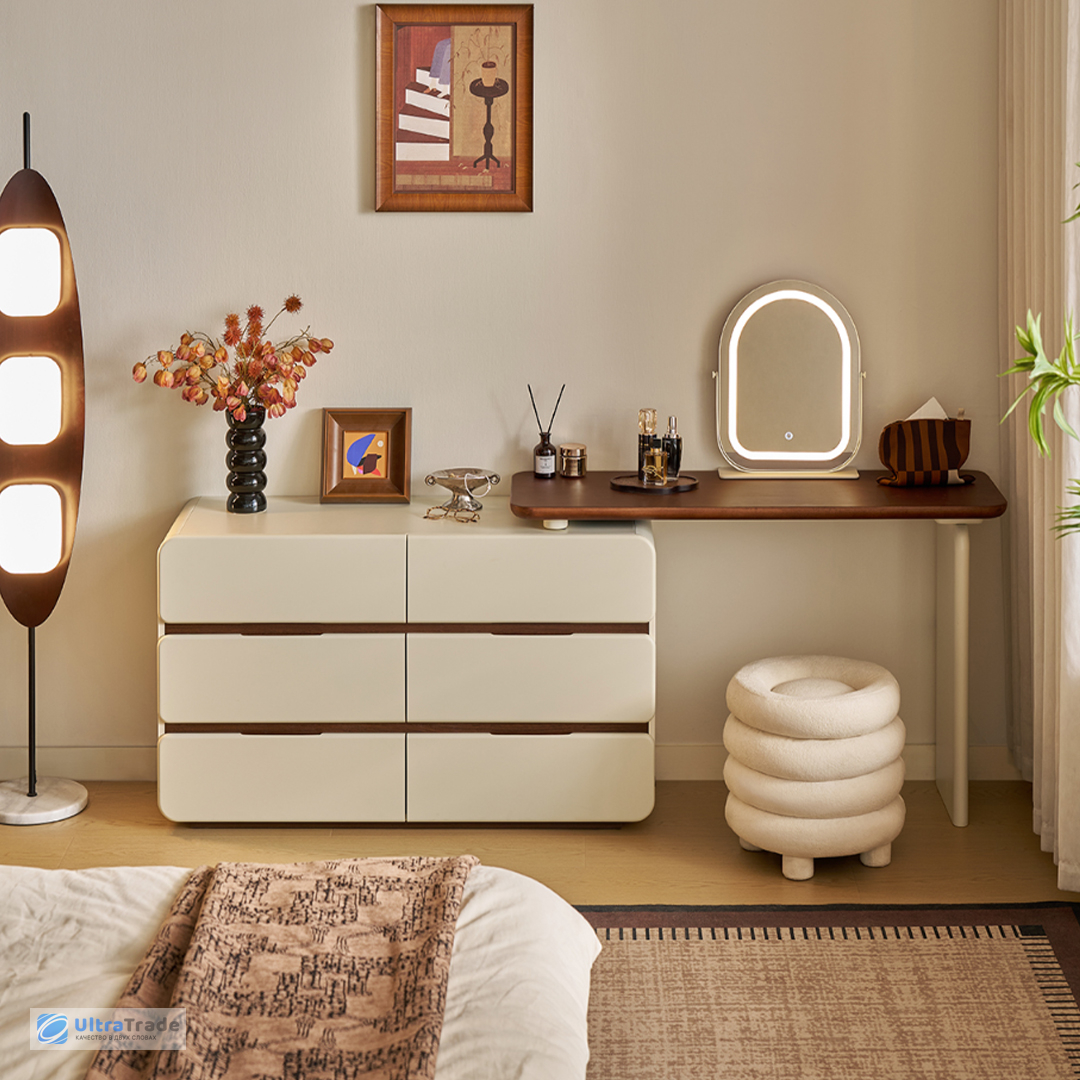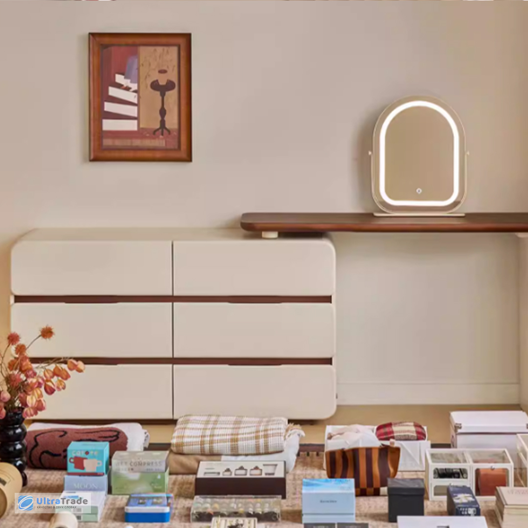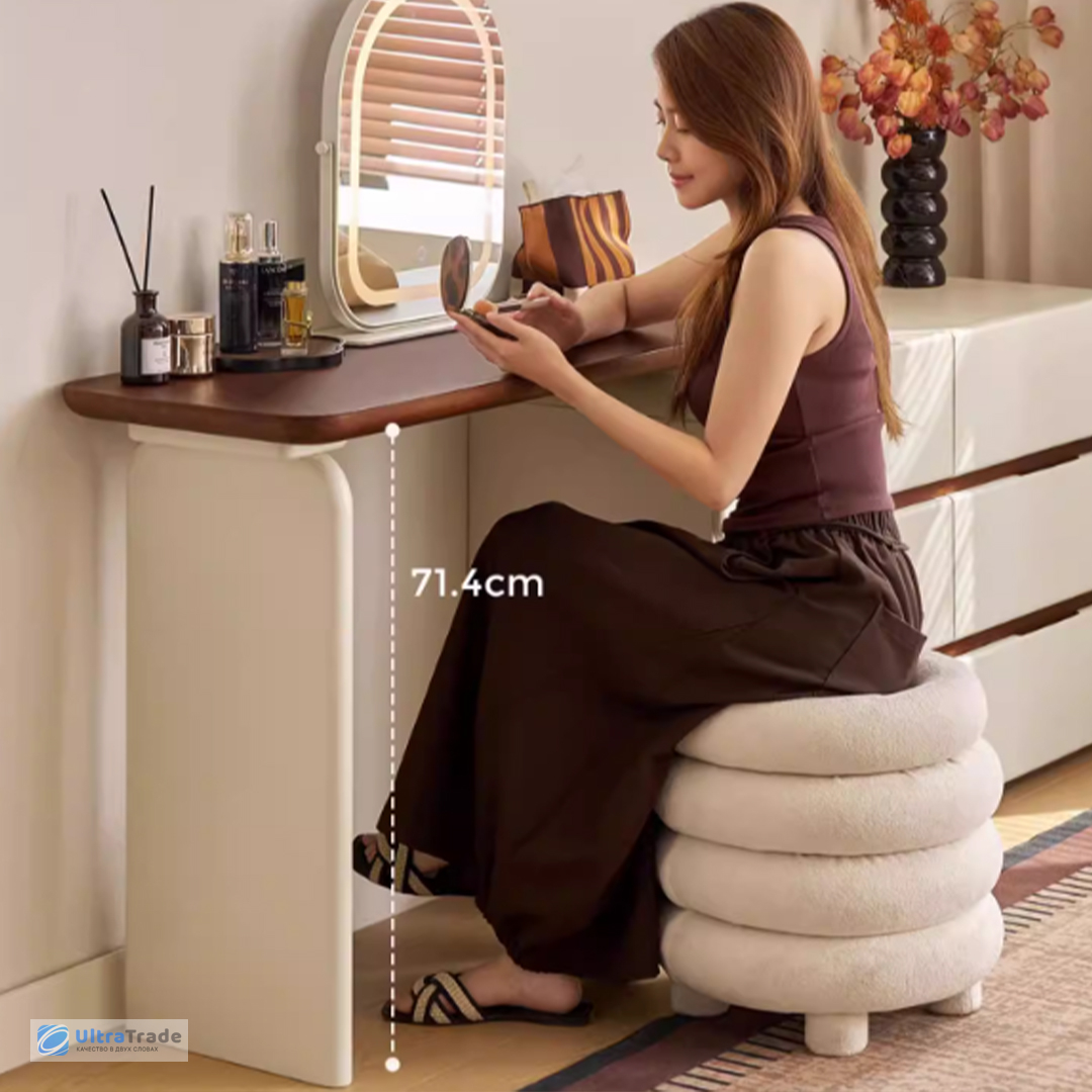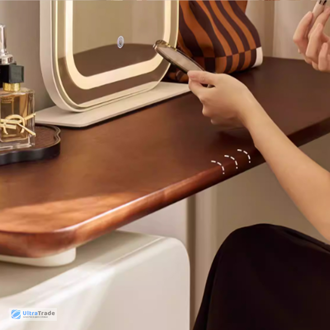 Продуманное хранение Этот столик организован по трёхуровневой системе: верхний ярус удобен для салфеток, книг, ноутбука, средний — для ежедневной косметики, нижний (ящики) — для более габаритных принадлежностей. Такое разделение позволяет быстро находить нужную вещь, не перерывая всё содержимое. |