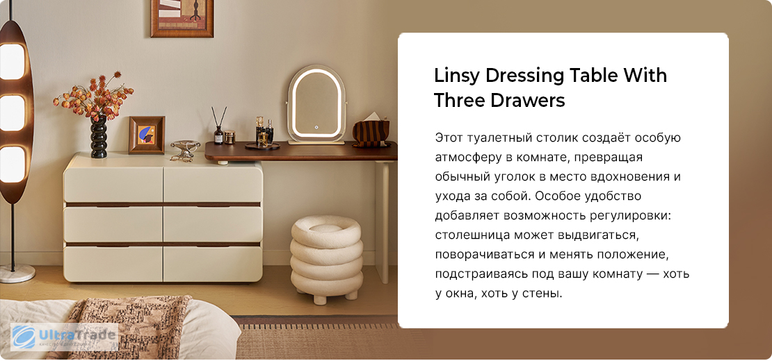Высота столика составляет 71,4 см — это позволяет удобно расположить ноги или поставить небольшое кресло-пуф. Вы не будете чувствовать себя скованно даже во время долгого макияжа или работы за компьютером.
