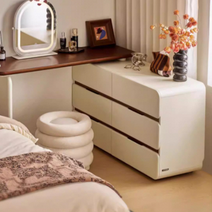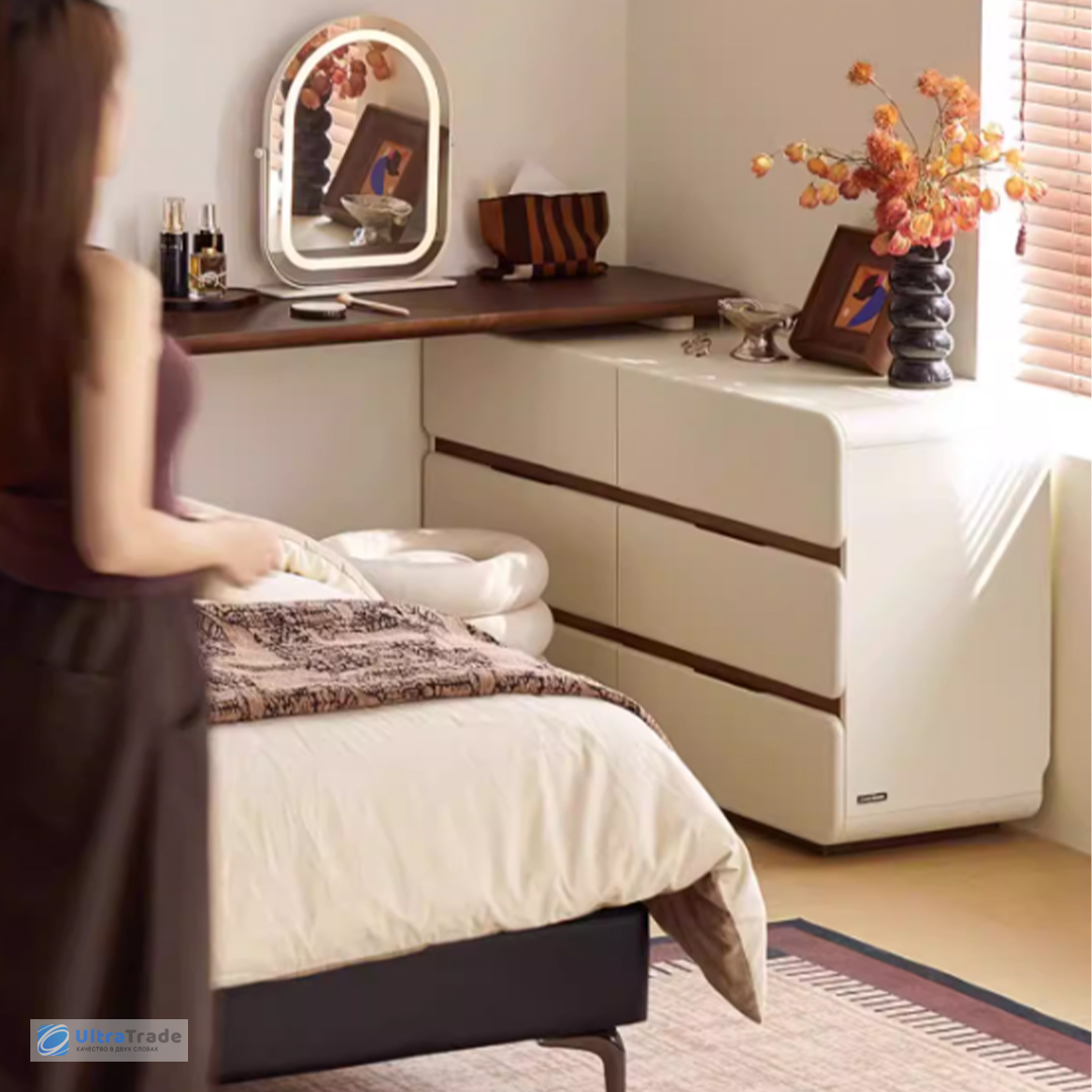 Все углы и кромки столика тщательно скруглены и отшлифованы — никаких заусенцев или острых граней. Поверхность ящиков и корпуса выполнена без выступающих ручек и элементов, поэтому можно свободно перемещаться рядом со столиком, не боясь задеть бок или колено.