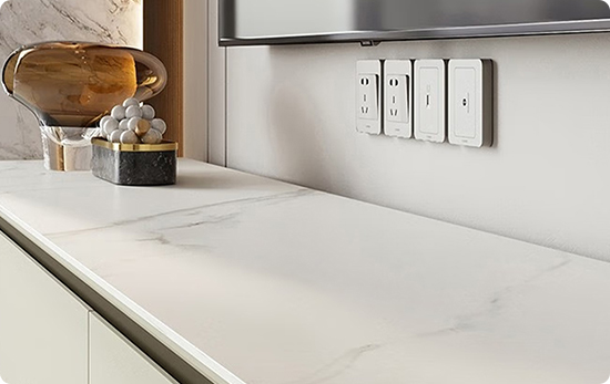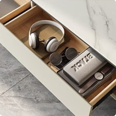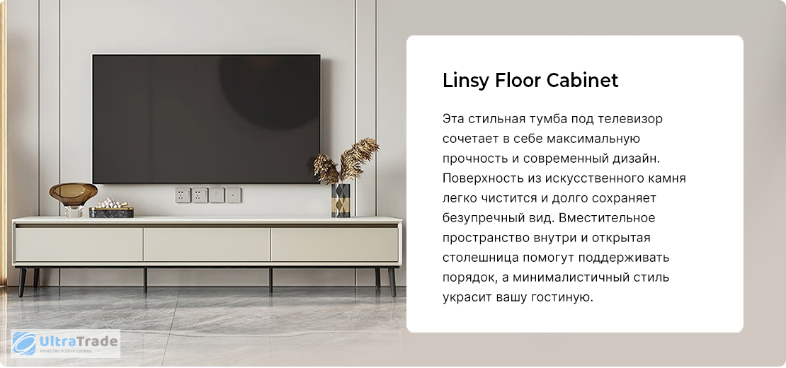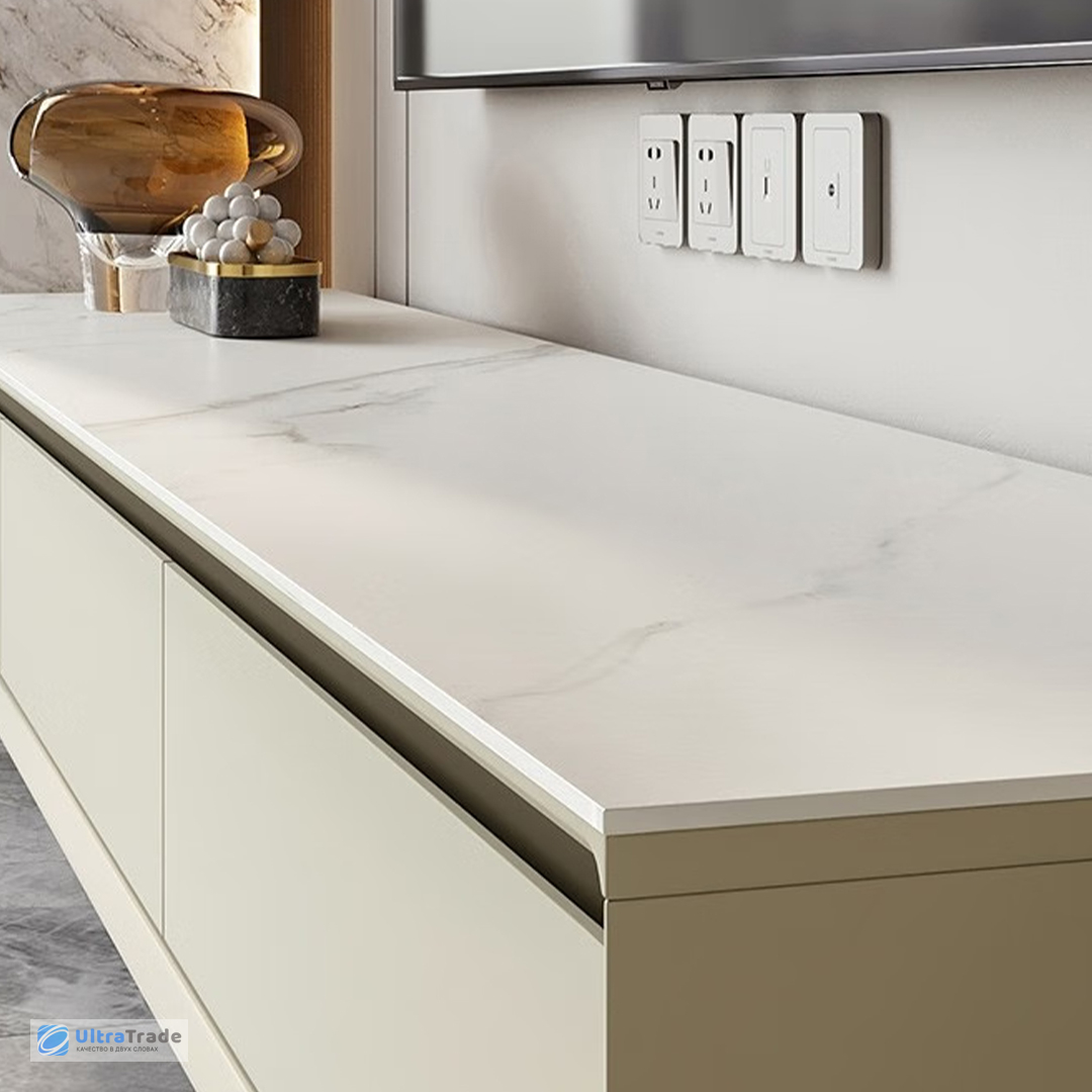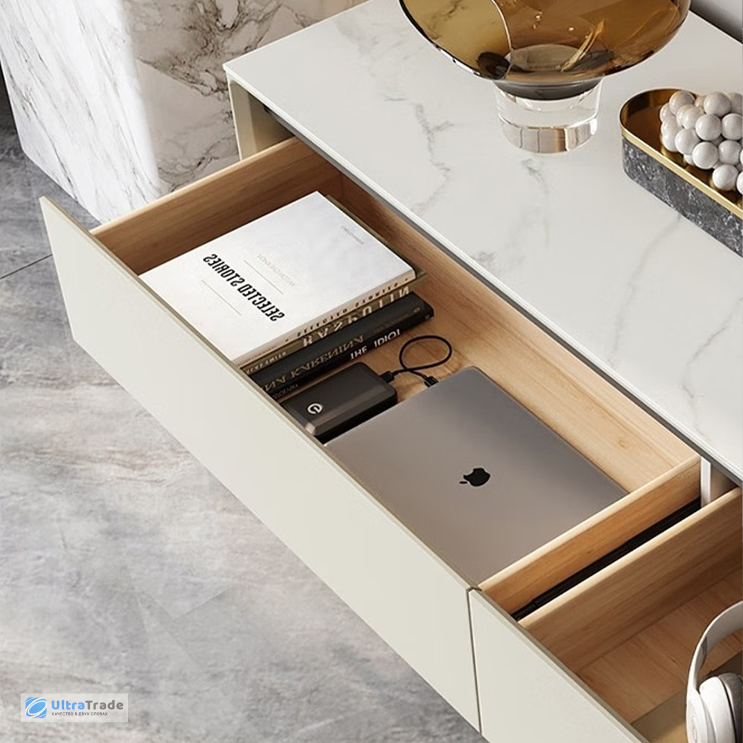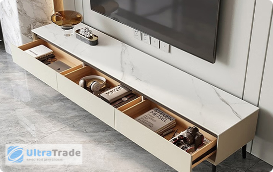 Просторная столешница Практичная столешница из прочного искусственного камня не только эффектно выглядит, но и долговечна в использовании. Продуманная ширина позволяет удобно использовать пространство. Просторная верхняя панель тумбы (40 см) позволяет разместить все необходимые устройства: телевизионную приставку, роутер, колонки, декор, фотографии и другие предметы — всё будет под рукой и в идеальном порядке. |