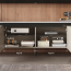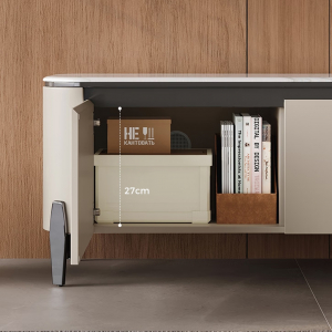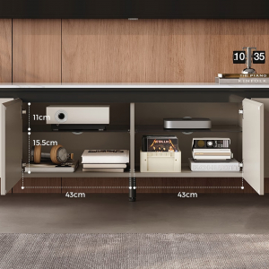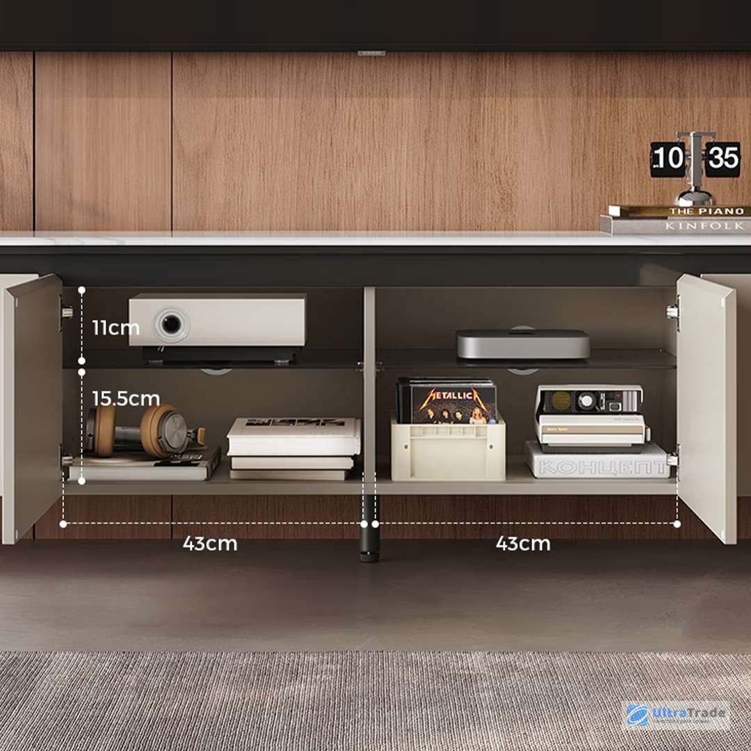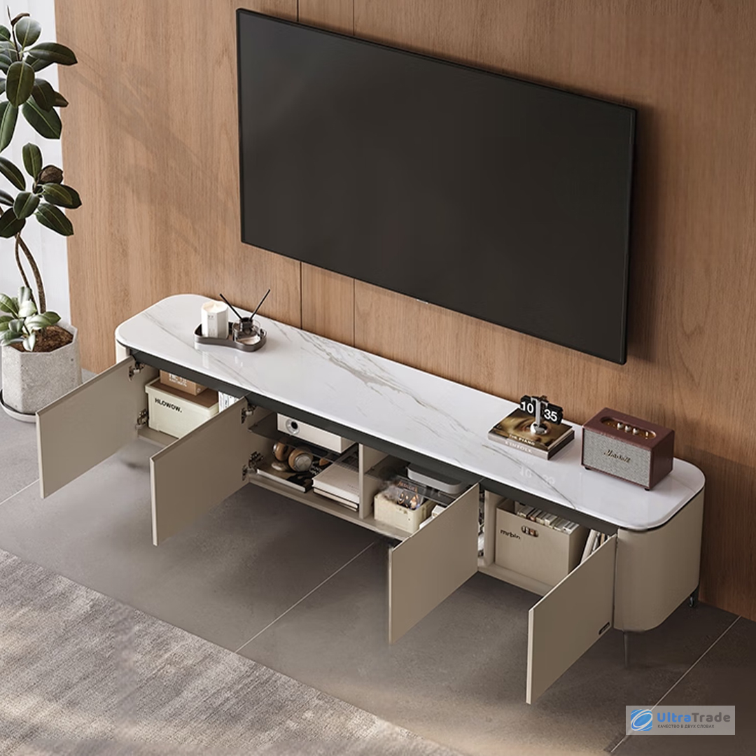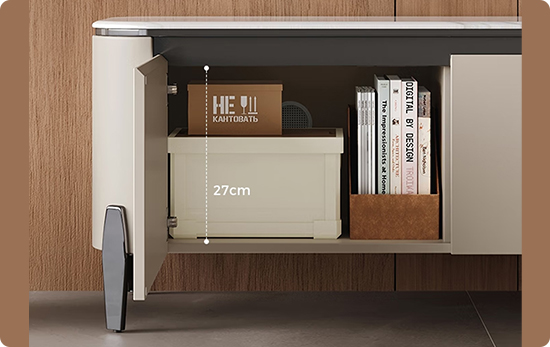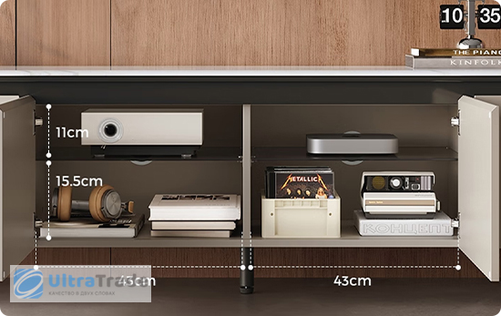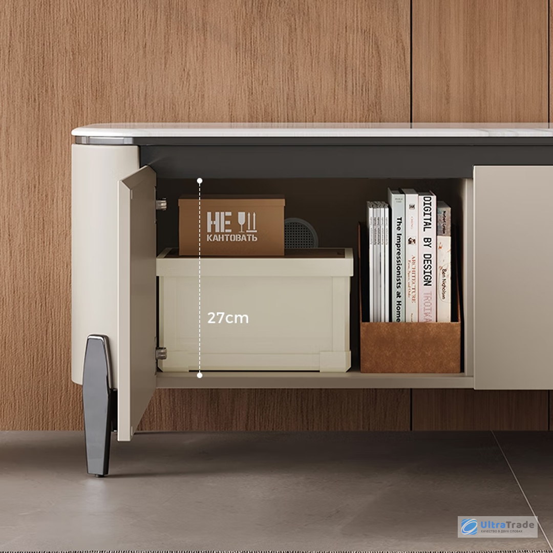 Тумба разделена на 4 функциональных отделения с дверцами, обеспечивающих организованное хранение всех необходимых вещей. По бокам расположены вместительные секции высотой 27 см — здесь легко разместятся коробки, техника и другие объёмные предметы.